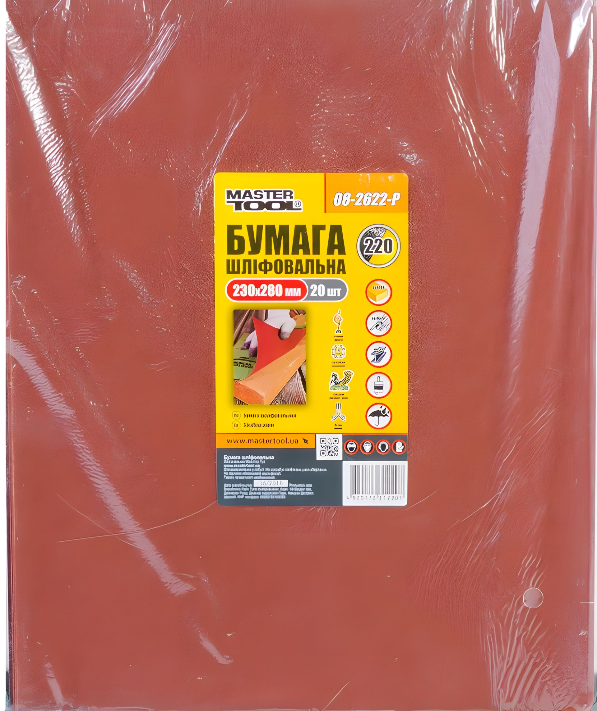 Водостойкая шлифовальная бумага Р220, 230×280 мм, комплект 20 шт., MASTERTOOL 08-2622-Р