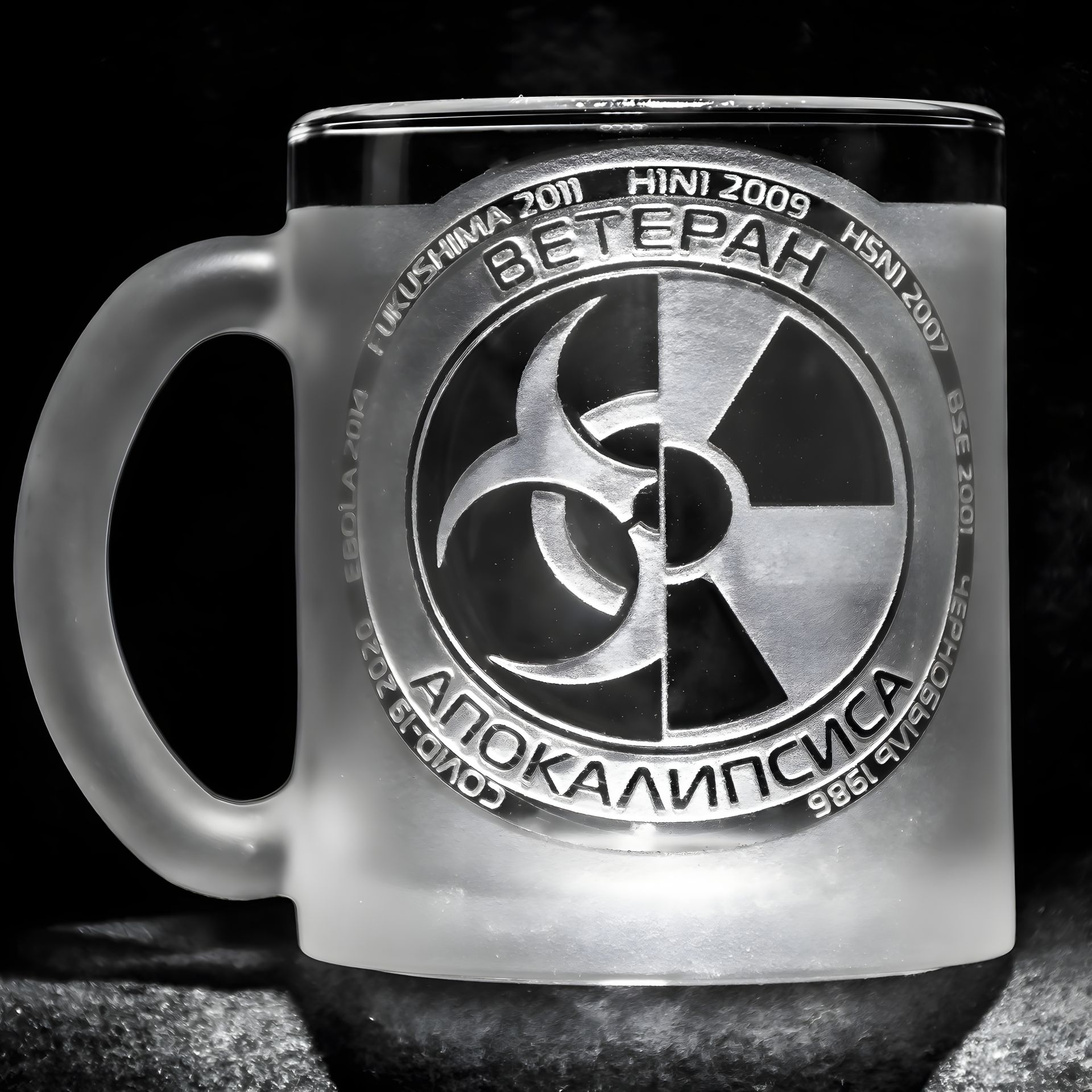 Стеклянная чашка для чая и кофе с ручной, механической гравировкой Ветеран апокалипсиса, матовая