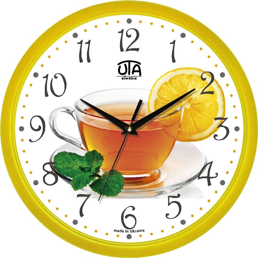 Настенные часы в кухню ЮТА “Классика” (30 cм) 01 Y 70 “Чай с лимоном” характеризуются круглой формой, диаметром 30 см, толщиной 4,5 см, вес 0,35 кг. предназначены для индикации текущего времени в часах и минутах.