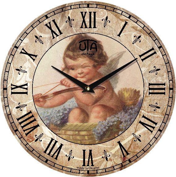Настенные часы ЮТА “Vintage” (33 cм) 003 VP “Ангелочек” имеют круглую форму, диаметр 33 см, толщину 2,7 см, вес 0,6 кг.