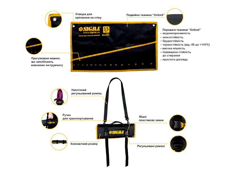 Чехол, имеет удобную ручку для переноса набора, а также оснащен регулируемым, съемным наплечный ремнем, имеет прочные пластиковые замки и прочный тканевый материал (двойная ткань Oxford с прорезиненными карманами, плотность 600D). Чехол сшит добротно и качественно, все строчки выполнены аккуратно, нитки хорошо закреплены и не распускаются. Каждый отсек имеет маркировку (размер гаечного ключа) для удобства в поиске нужного инструмента.