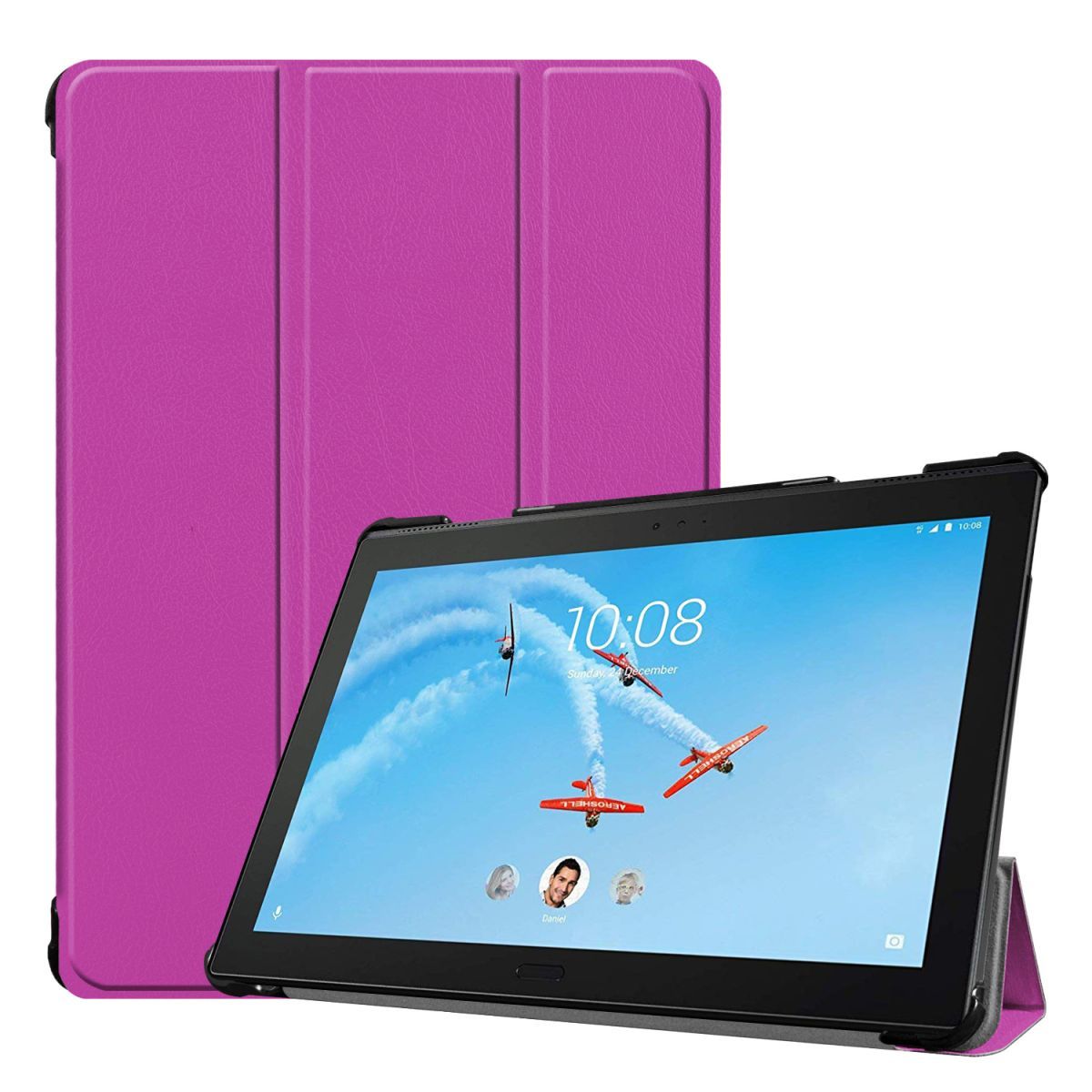 Чохол Lenovo Tab 5 P10 TB-X705 зовні обклеєний шкірою пересованої виглядає дуже стильно, а завдяки своїй структурі чітко повторює форму планшета. Пластикова основа чохла, яка засувається на задню частину планшета, зроблена з міцного, але в той же час не товстого пластику. Для того щоб ваш планшет менше піддавався дрібним пошкодженням зсередини пластик обклеєний мікрофіброю, яка плавно переходить в обкладинку, яка закриває екран. Зовнішній матеріал також цілісним шматком переходить із задньої кришки на передню частину яка закриває екран. Природно зроблений він виключно для Lenovo Tab 5 P10 TB-X705, так що всі камери, регулятори, кнопки і отвори будуть легко доступні. Конструкція чохла дозволяє без особливих зусиль перетворити його на підставку, що дуже зручно, коли ви втомилися і хочете просто подивитися фільм. Ви просто складаєте пробігану передню обкладинку по згинах і у вас виходить трикутна підніжка lenovo Tab 5 P10 TB-X705, а за рахунок вшитих всередину магнітів вона в такому стані тримається дуже міцно. А на додаток до цього є ще одна дуже зручна функція - при закритті чохла екран гасне завдяки спеціальним внутрішнім магнітам.