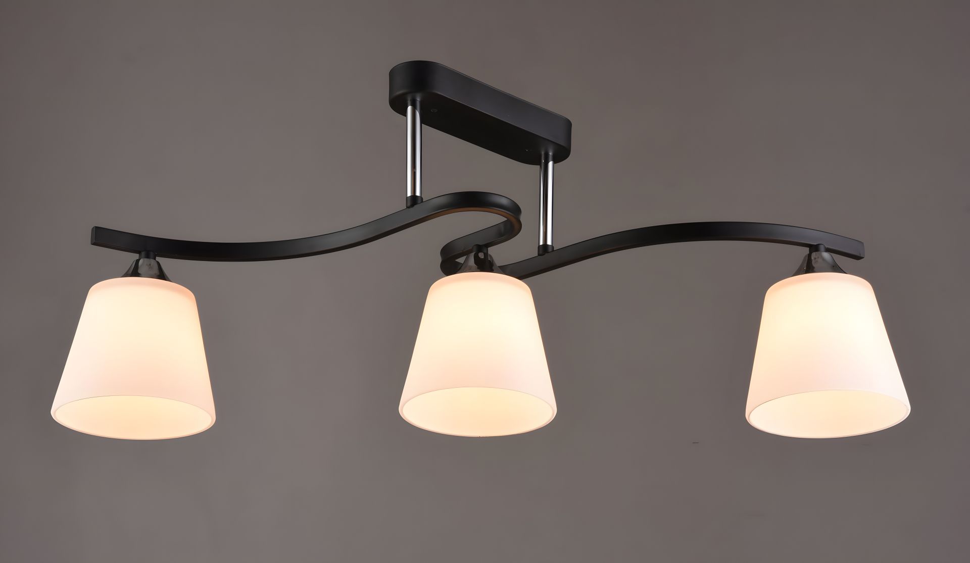 С тремя плафонами из стекла белого цвета, эта люстра рассеивает свет равномерно, создавая приятную и уютную атмосферу в вашем помещении. Цоколь Е27 подойдет для лампочек до 60 Ватт, что позволяет настроить освещение по вашим потребностям.