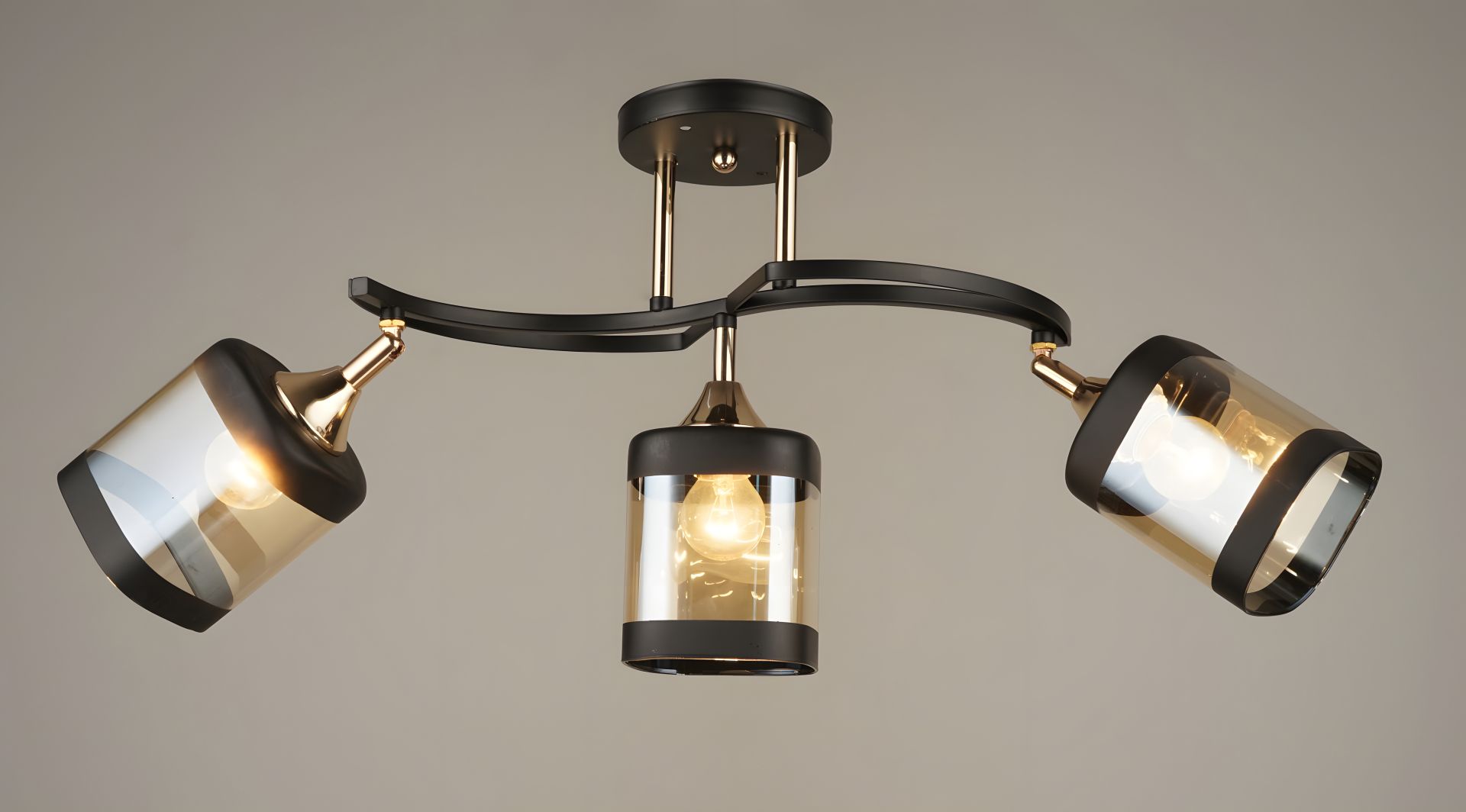 Люстра имеет три плафона, изготовленные из стекла бронзового цвета с черными элементами. Это придает освещению теплый и атмосферный оттенок, а черные детали придают контраст и стильный акцент.