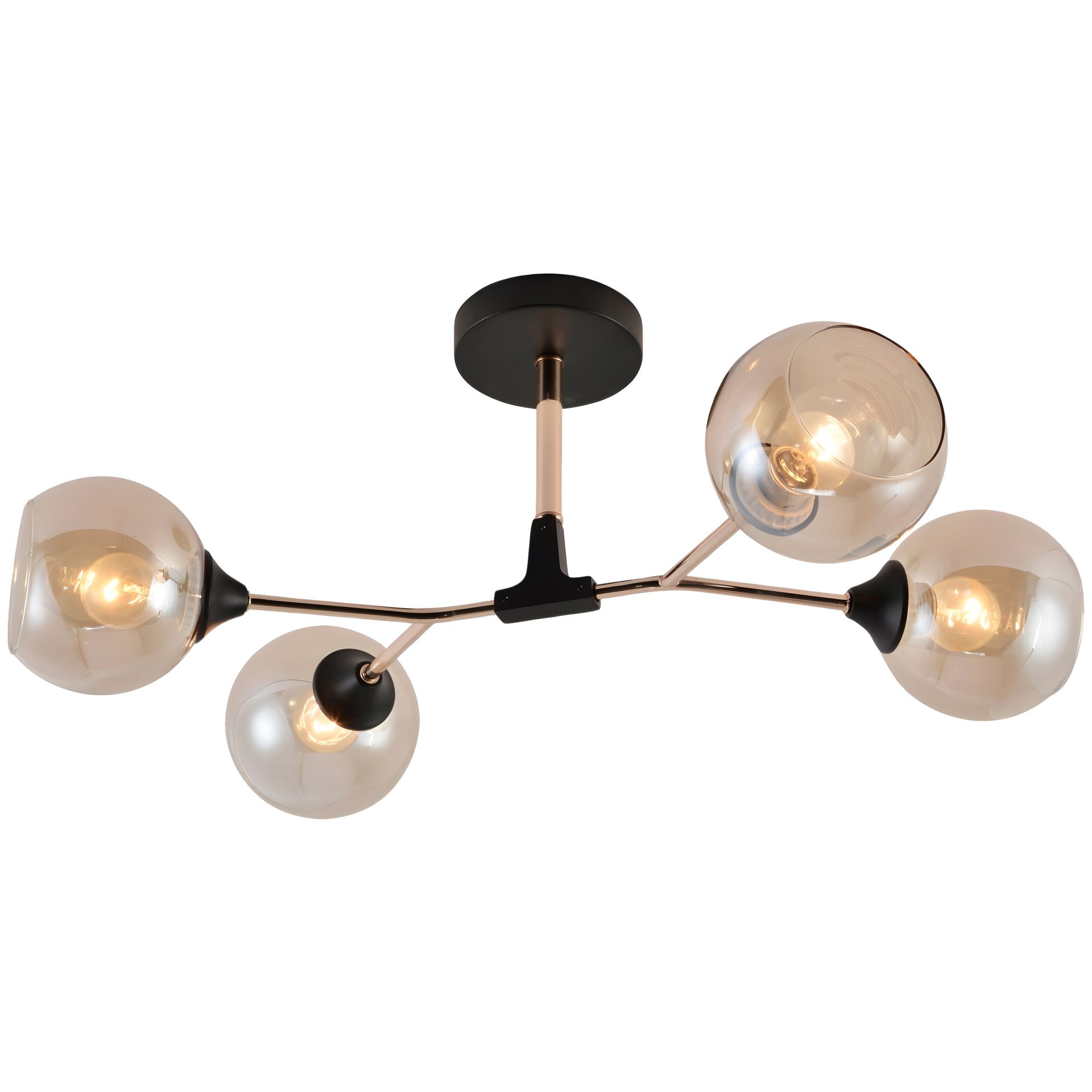 Каркас изготовлен из металла, выполнен в черном и позолоченном цвете, придает ей элегантный и современный вид. Четыре плафона из стекла с золотистым оттенком создают теплую атмосферу в вашем помещении.