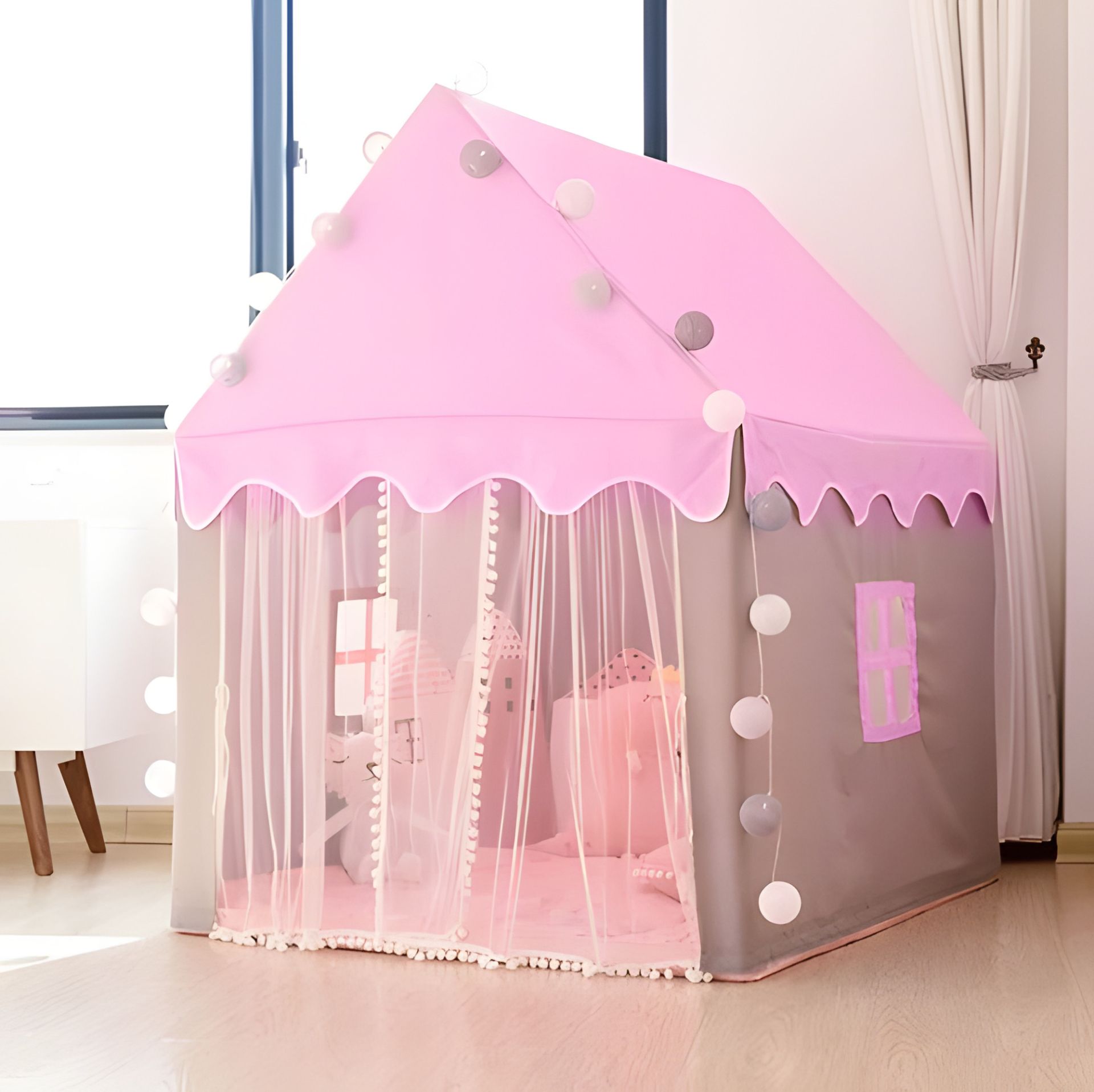 - МЕЧТА КАЖДОЙ ДЕВУШКИ – палатка для детей – отличное развлечение на долгие часы. Тканевая детская палатка в форме домика – подарок-мечта для каждого ребенка. Есть игровой домик для детей 2 Окна с мелкой сеткой и удобный подъезд. В нем можно спрятаться со своими любимыми игрушками и дать волю своему воображению. Дворец для детей станет идеальным местом для эмоционального и творческого развлечения как дома, так и на природе – например, в саду, на пикнике, на террасе или на пляже.