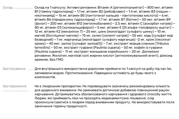 Марганец и витамины D, К способствуют поддержанию нормального состояния костей. Медь, фолиевая кислота, селен, цинк, а также витамины A, B12, C, D способствуют нормальному функционированию иммунной системы. Диетическая добавка содержит сульфиты и может содержать рыбные продукты.