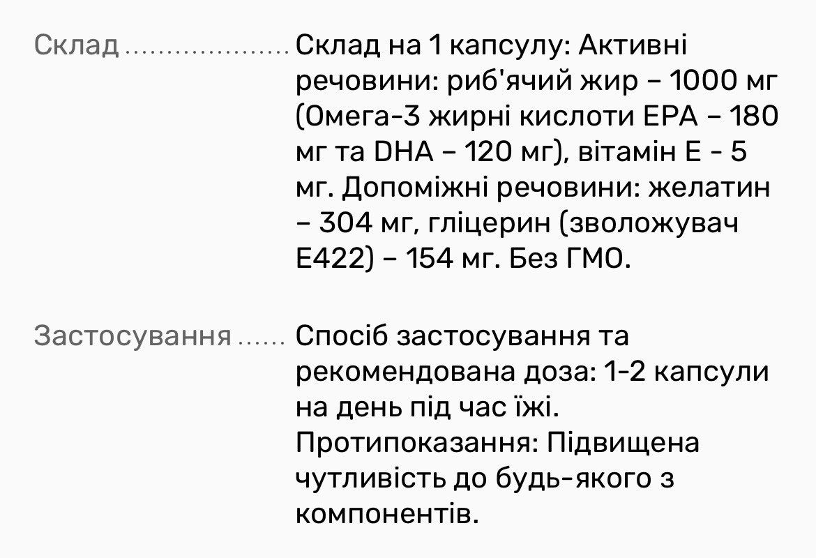 Показання до застосування: Підвищена збудливість, швидка стомлюваність, розумові перенавантаження, розсіяна увага та втрата концентрації, стресові стани, порушення в роботі серця. Продукт призначений для дорослих та дітей з віку, коли вони можуть самостійно ковтати капсулу. Ефект від застосування: Поліненасичені жирні кислоти Epa і Dha (Омега-3), які є активними діючими речовинами риб’ячого жиру, нормалізують розвиток мозку та нервової системи, зір і функцію серця, захищаючи від серцево-судинних захворювань. Крім того, вони стимулюють мозкову активність, підвищують інтелектуальні здібності та посидючість. Завдяки своїм імуномодулюючим й антиоксидантним властивостям вітамін Е покращує працездатність та стійкість організму до захворювань.