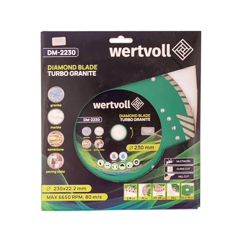 Алмазный диск WERTVOLL TURBO GRANITE 230×3 мм предназначен для интенсивного реза гранита, мрамора, песчаника, тротуарной плитки и других твёрдых каменных материалов. Диаметр 230 мм обеспечивает большую глубину реза, что удобно при раскрое толстых плит, бордюров и блоков. Турбо-сегментированный обод обеспечивает высокую скорость работы и эффективный отвод шлама.
