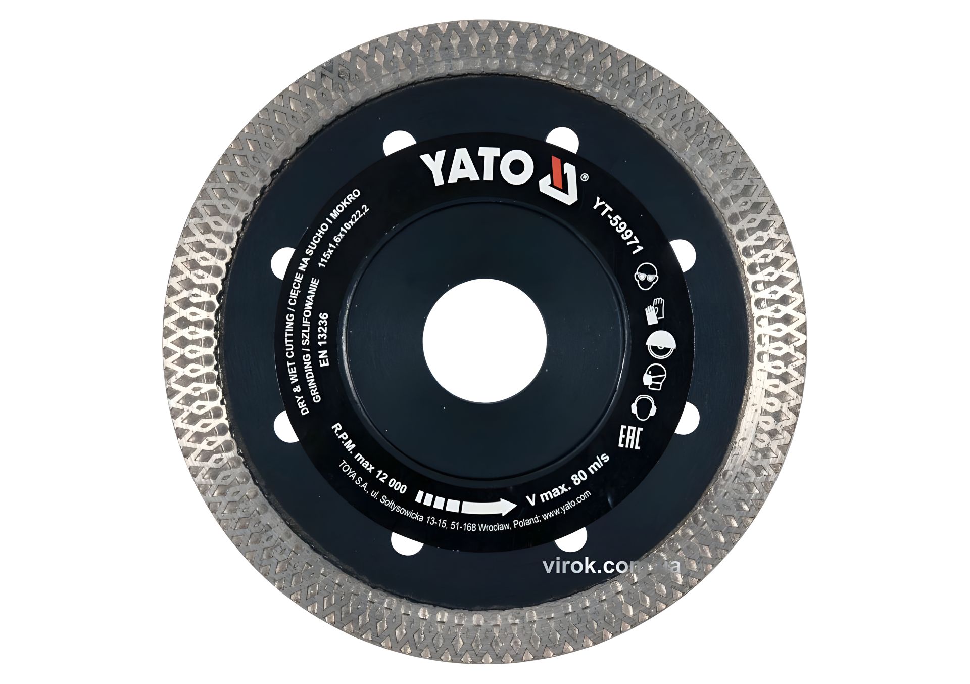 Диск отрезной алмазный по гресу, стеклу, керамике YATO Ø=115x1.6x10x22.2 мм, в сухом режиме