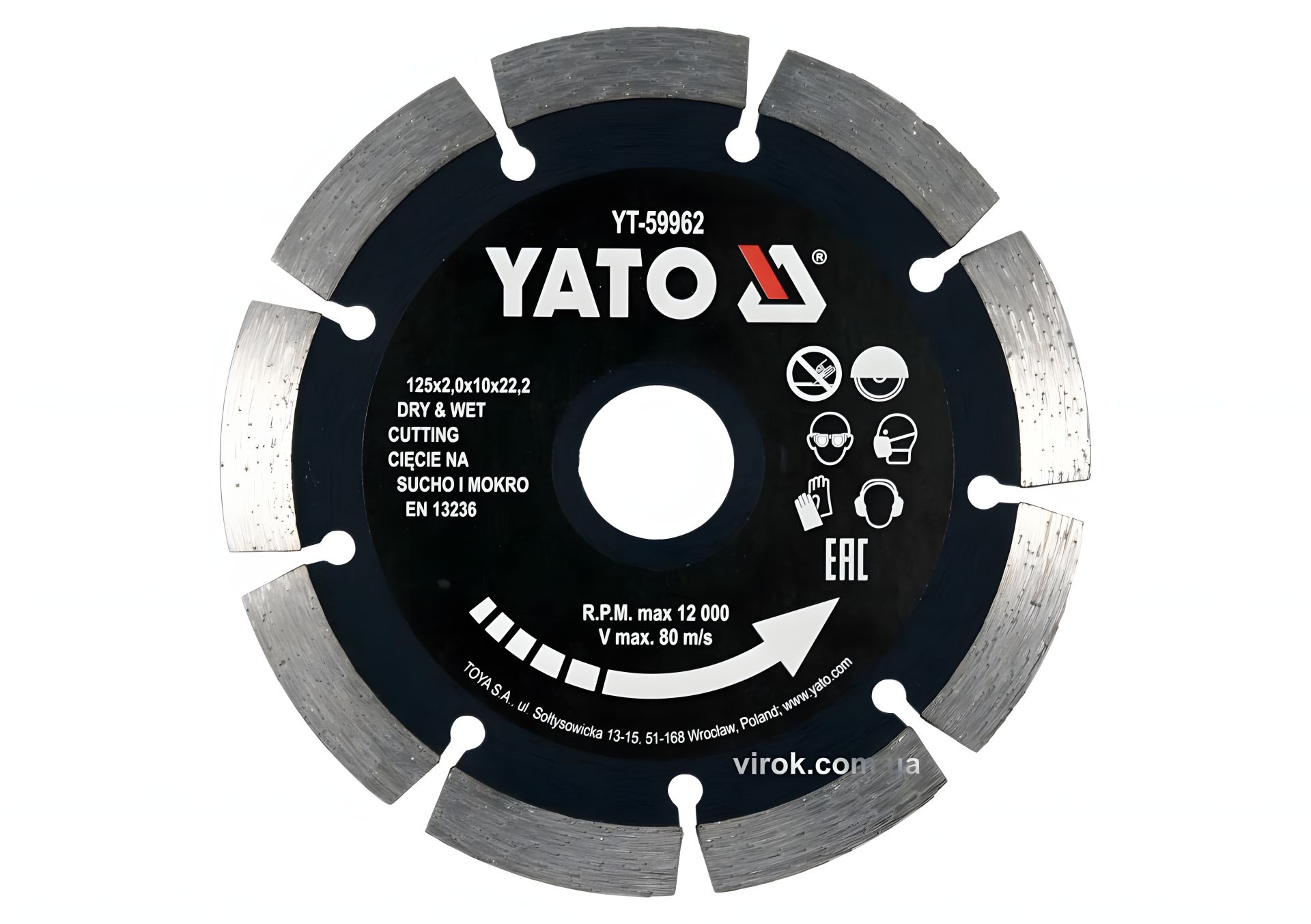 Диск отрезной алмазный по камню и бетону YATO Ø=125x2x10x22.2 мм, в мокром и сухом режиме