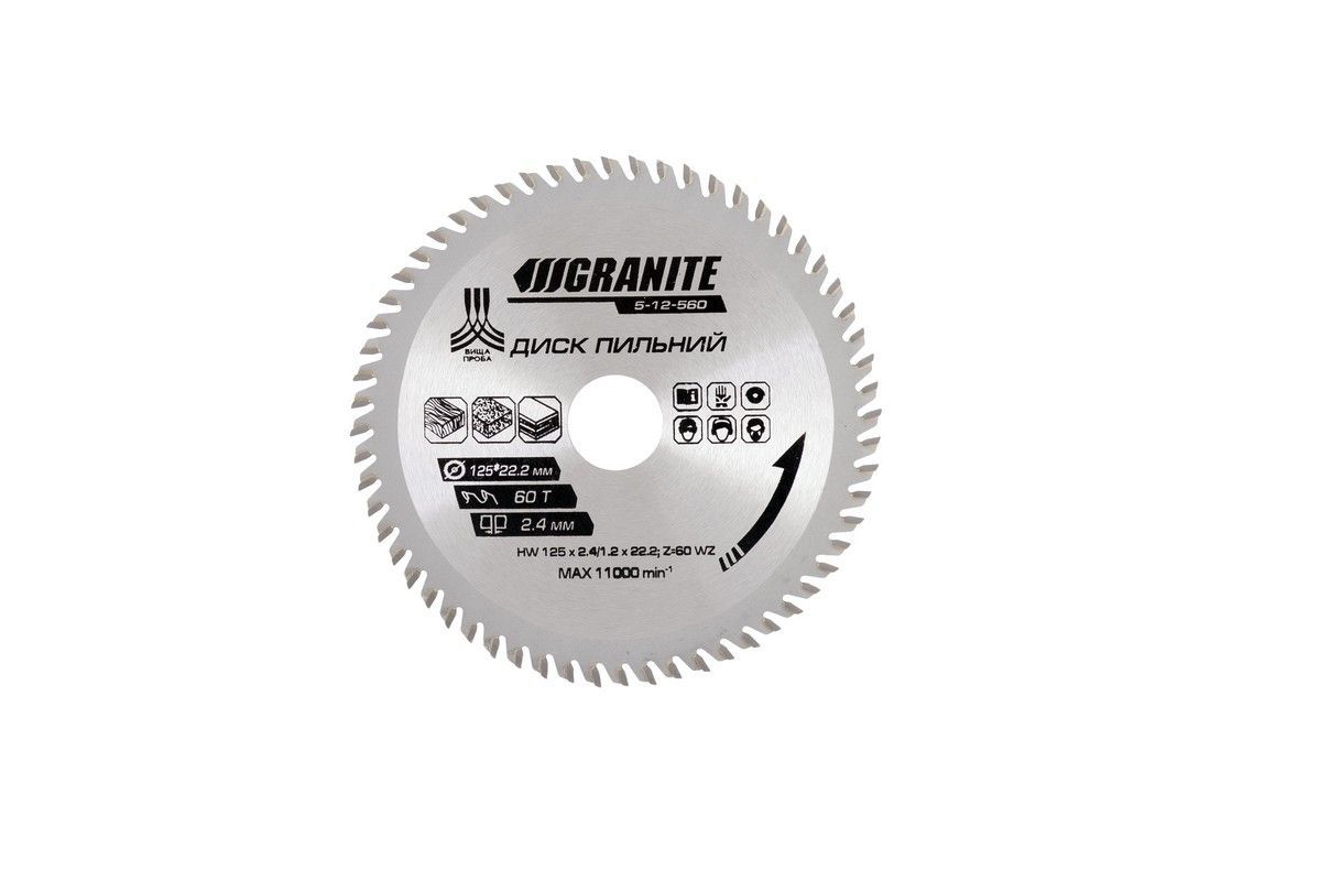 Диск пильный для дерева с твердосплавными напайками 125х22.2х60Т 12000 об/мин MASTERTOOL 5-12-560