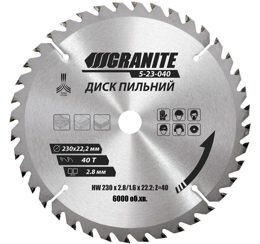 Пильный диск для дерева с твердосплавными напайками 230х22.2х40Т 8000 об/мин MASTERTOOL 5-23-040