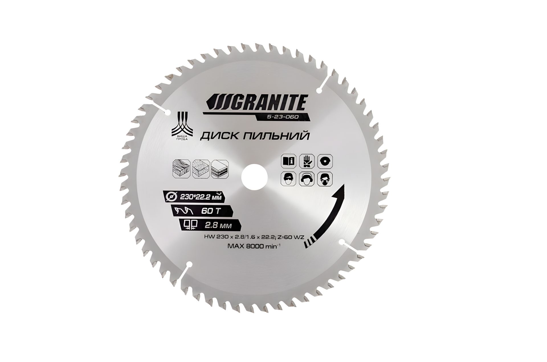 Дисковая пила для дерева с твердосплавными напайками 230х22.2х60T, 8000 об/мин, MASTERTOOL 5-23-060