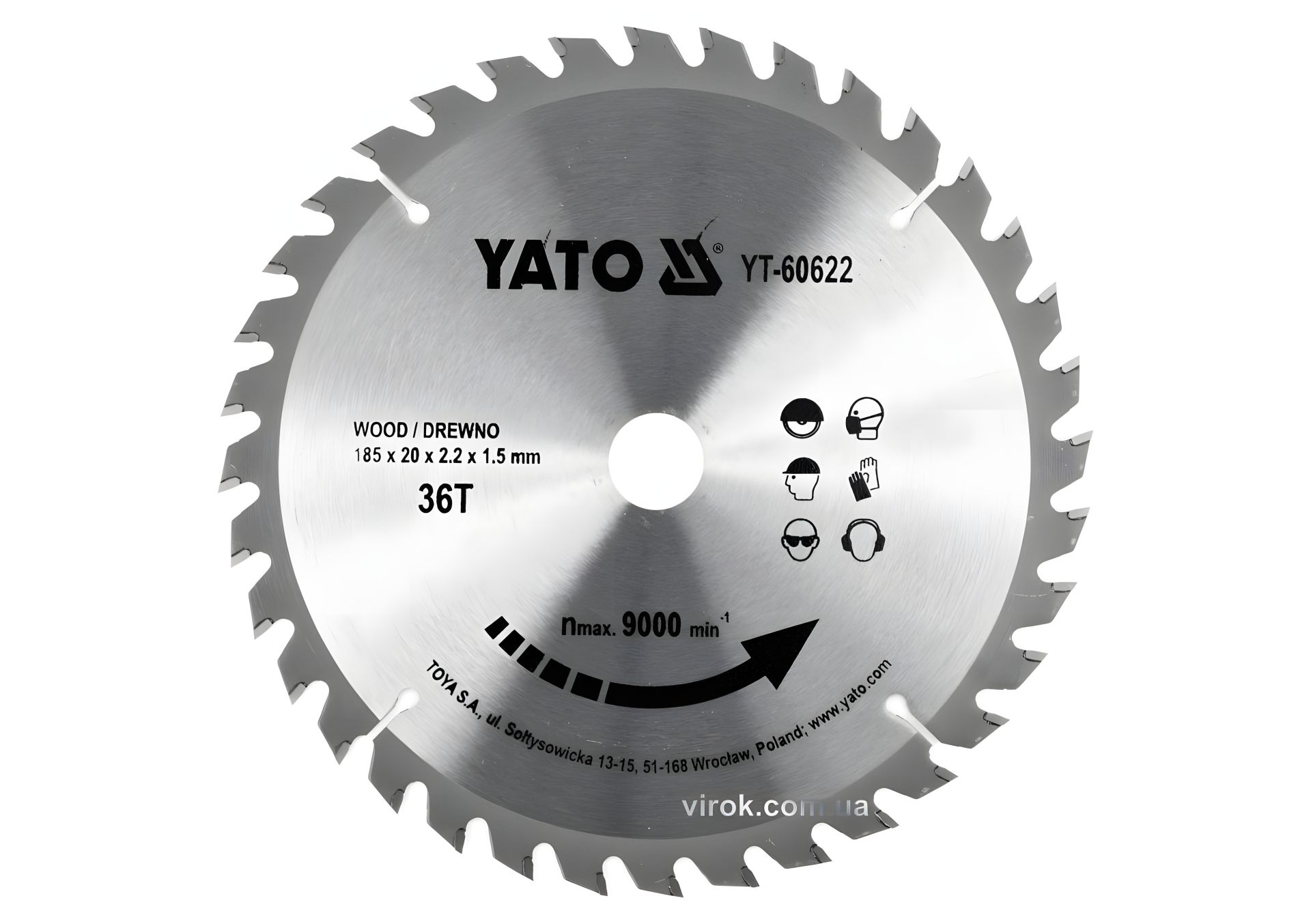 Диск пильный победитовый по дереву : 185x20x2.2x1.5 мм, 36 зубьев, R. P. M до 9500 1/мин YaTo YT-60622