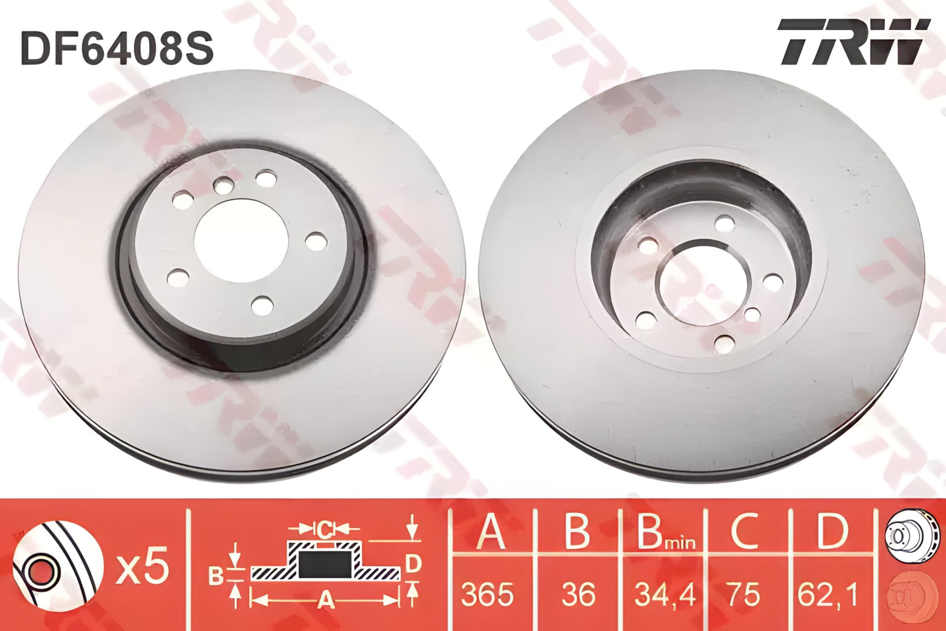 Диск тормозной для BMW X5/X6 F 365mm 07, TRW (DF6408S)