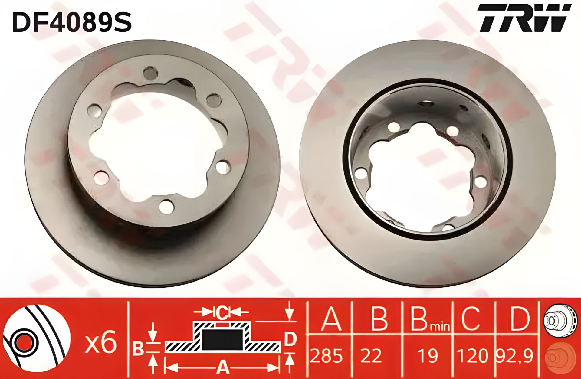 Диаметр [мм] : 285 Высота [мм] : 93 Тип тормозного диска : безвоздушный Диаметр барабана : 169 Толщина тормозного диска (мм) : 22 Размер резьбы : 15 Минимальная толщина [мм] : 19 Цвет : черный Количество отверстий : 6 Диаметр центрирования [мм] : 120 ? фаски [мм] : 145 Поверхность : лакированный VOLKSWAGEN 2D0615601B MERCEDES BENZ 9044230112 A9044230312 A9044230112 9044230212 9044230312 A9044230212 VW LT 28-46 II c бортовой платформой/ходовая часть (2DC, 2DF, 2 2.8 TDI | c бортовой платформой/ходовая часть | Дизель AUH, BCQ | 116 kw | 158 hp | 04.2002-07.2006 VW LT 28-46 II c бортовой платформой/ходовая часть (2DC, 2DF, 2 2.8 TDI | c бортовой платформой/ходовая часть | Дизель ATA | 96 kw | 130 hp | 01.1999-07.2006 VW LT 28-46 II c бортовой платформой/ходовая часть (2DC, 2DF, 2 2.8 TDI | c бортовой платформой/ходовая часть | Дизель AGK | 92 kw | 125 hp | 07.1997-01.2002 VW LT 28-46 II c бортовой платформой/ходовая часть (2DC, 2DF, 2 2.5 TDI | c бортовой платформой/ходовая часть | Дизель ANJ, AVR | 80 kw | 10