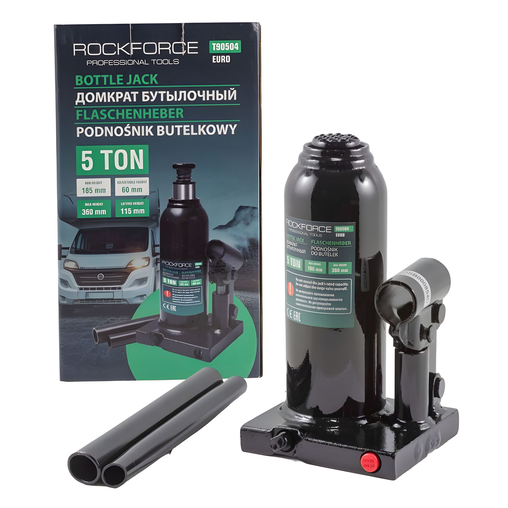 Домкрат гидравлический бутылочный ROCKFORCE RF-T90504 используется для поднятия грузов массой до 5 т на высоту 216-413 мм. Подходит для автомобилей с высоким клиренсом. Домкрат будет полезен автолюбителям в гараже и дороге, а также сотрудникам СТО.