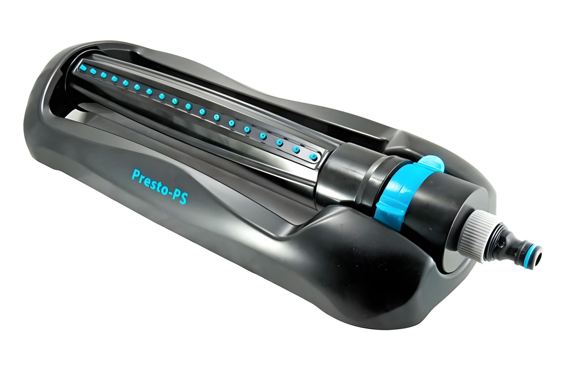 Дощувач осцилюючий Presto-PS Сова (7814) використовується для зрошення середніх і невеликих газонів, підійде так само і для поливу городу. Ці дощовики розбризкують воду через 18 форсунок тонкими струменями, імітуючи природний дрібний дощ, і обробляють прямокутний сектор 14 х 17 метрів площею до 238 м2. У конструкції дощовиків використовується довговічний автоматичний запатентований автоматичний турбомотор із застосуванням унікальних композитних матеріалів, який працює від води, що проходить через нього. Ширина поливу легко регулюється за допомогою повзунків на корпусі дощовиків. Робочий тиск 2-4 атмосфери. Витрата води при тиску 2 атмосфери до 0,8 м?/год. Для продовження терміну служби зрошувача рекомендується використання в системі подачі води фільтра грубого очищення. Сопла виготовлені з гуми і легко чистяться комплектною голкою для форсунок. Підключається зрошувач до садових шлангів діаметром 1/2, 5/8 і 3/4 дюйма за допомогою стандартних конекторів.