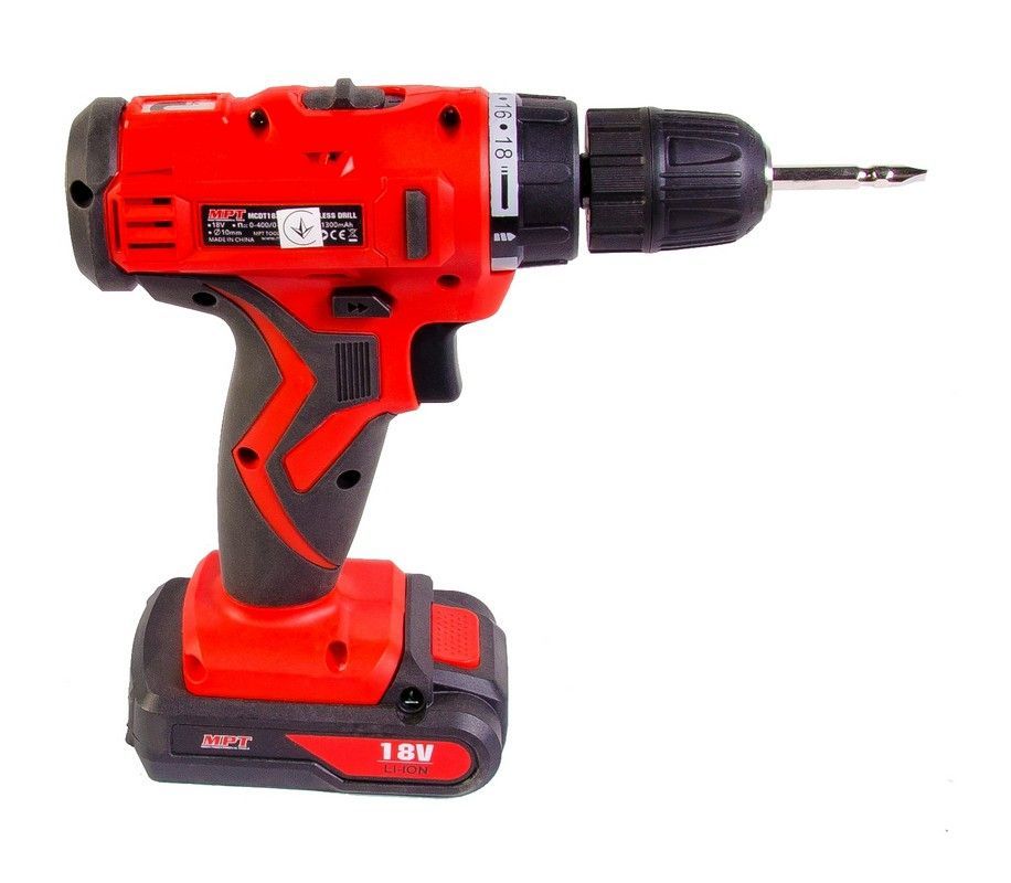 Аккумуляторная дрель-шуруповерт 18V Li-ion 1.3 А·ч двухскоростная 0-400/1450 об/мин 10 мм 2 АКБ кейс MASTERTOOL MCDT1823.A2