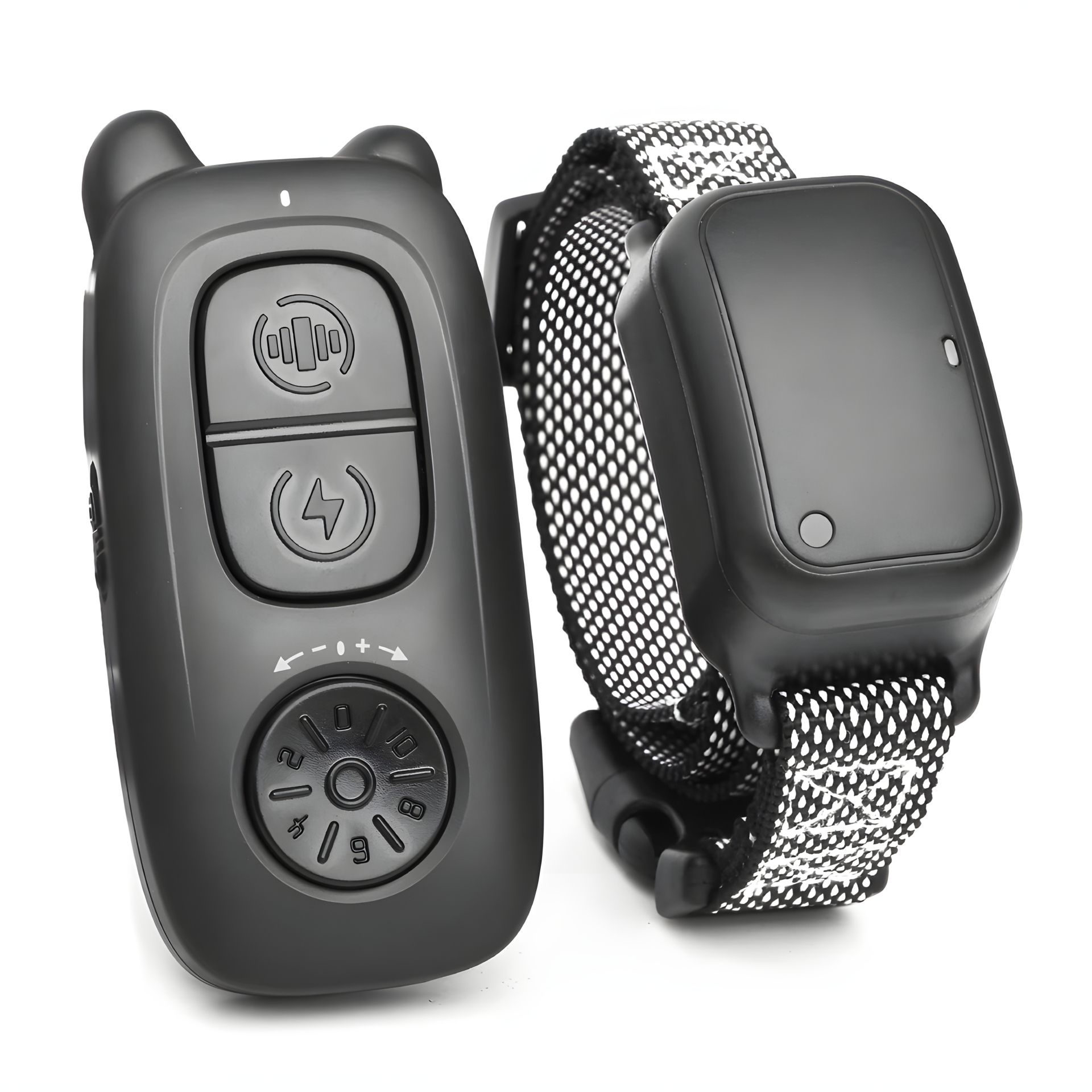 На дистанционном пульте расположены кнопки включения, выбора одного из трёх видов воздействия - электрошок, вибрация или звук и колесико выбора уровня интенсивности от 0 до 10. К пульту можно привязать в случае необходимости 2 ошейника и переключаться между ними кнопкой на пульте.