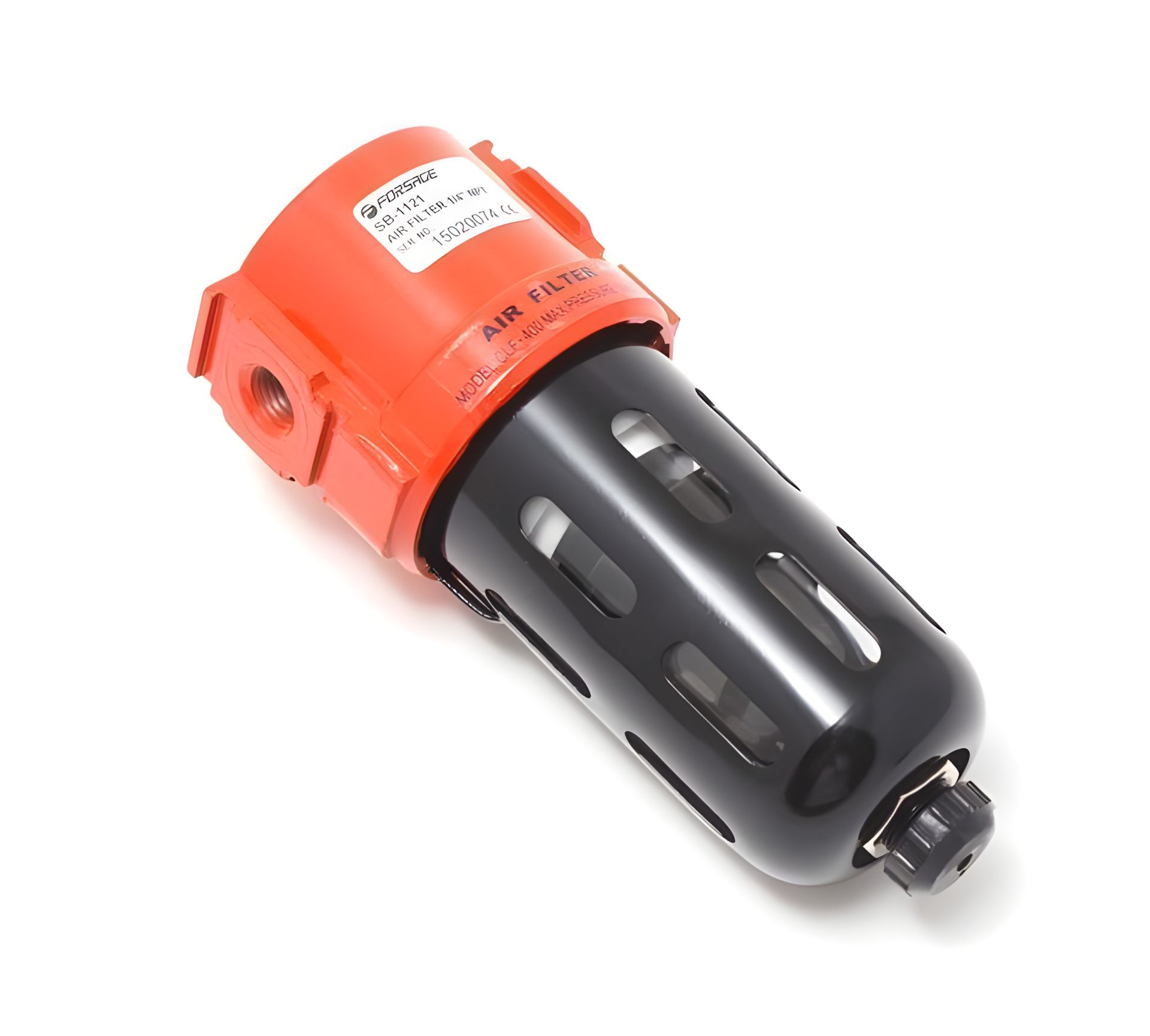 Пневматический фильтр FORSAGE F-SB-1121 предназначен для очистки сжатого воздуха от твердых частиц и конденсата. Конструкция отличается высокой надежностью благодаря ударопрочным пластиковым колбам с защитными металлическими чашами.