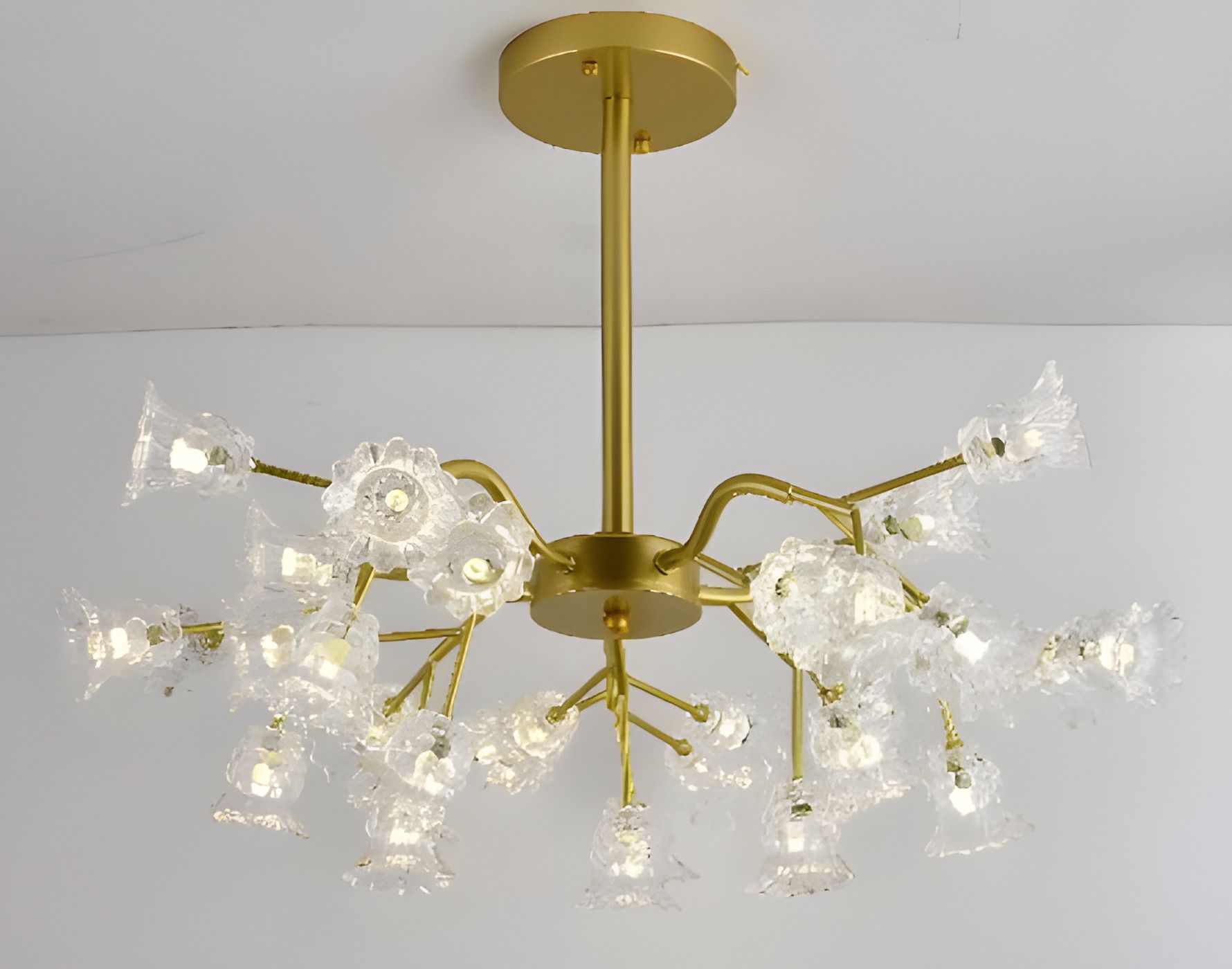 - Плафоны: Люстра имеет 30 маленьких прозрачных плафонов по форме цветочков. Эти цветочки придадут особую утонченность и шарм освещению, создавая волшебную атмосферу в помещении.