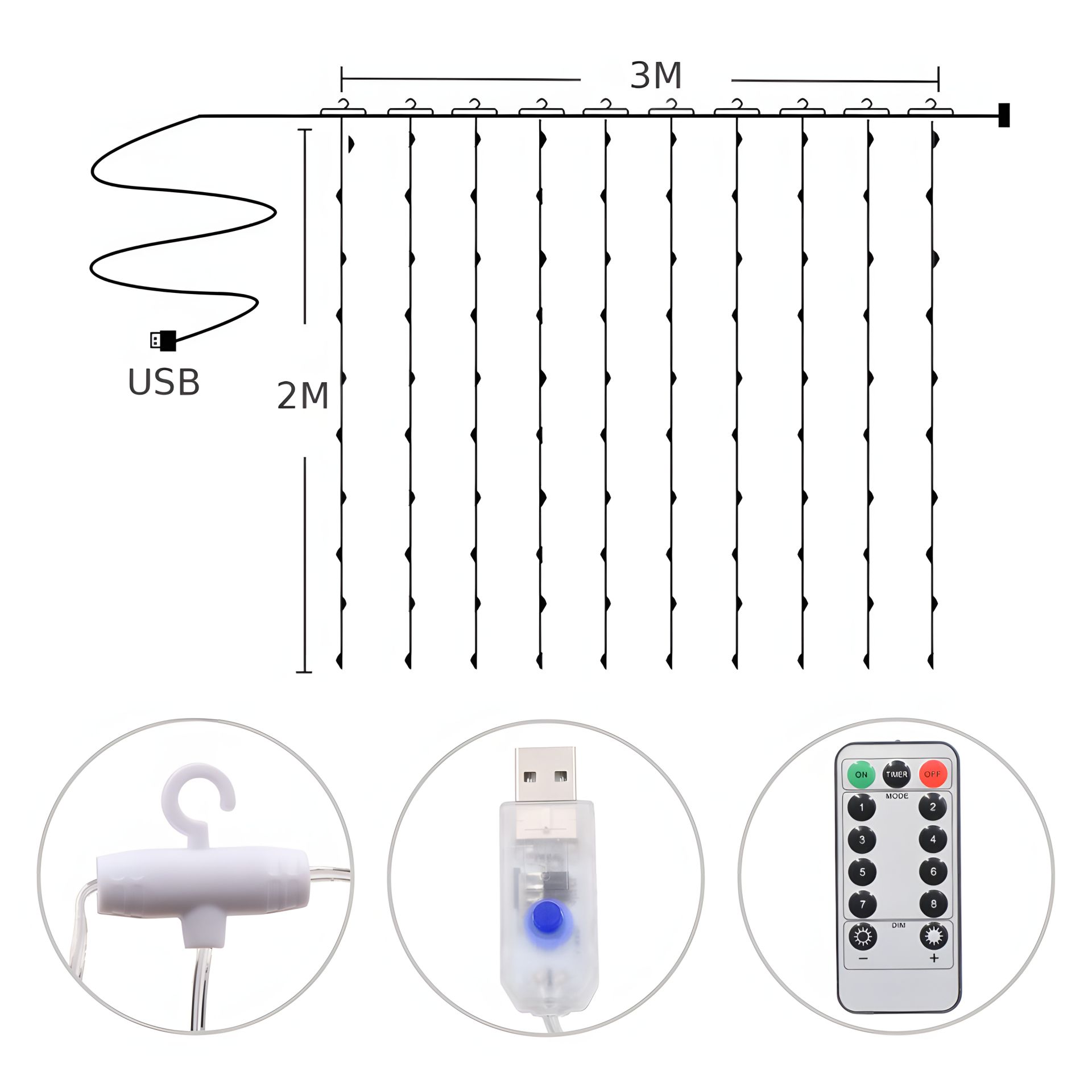 Светодиодная гирлянда № 5 штора-роса 3x2м (холодный белый/USB/Пульт/8 режимов)
