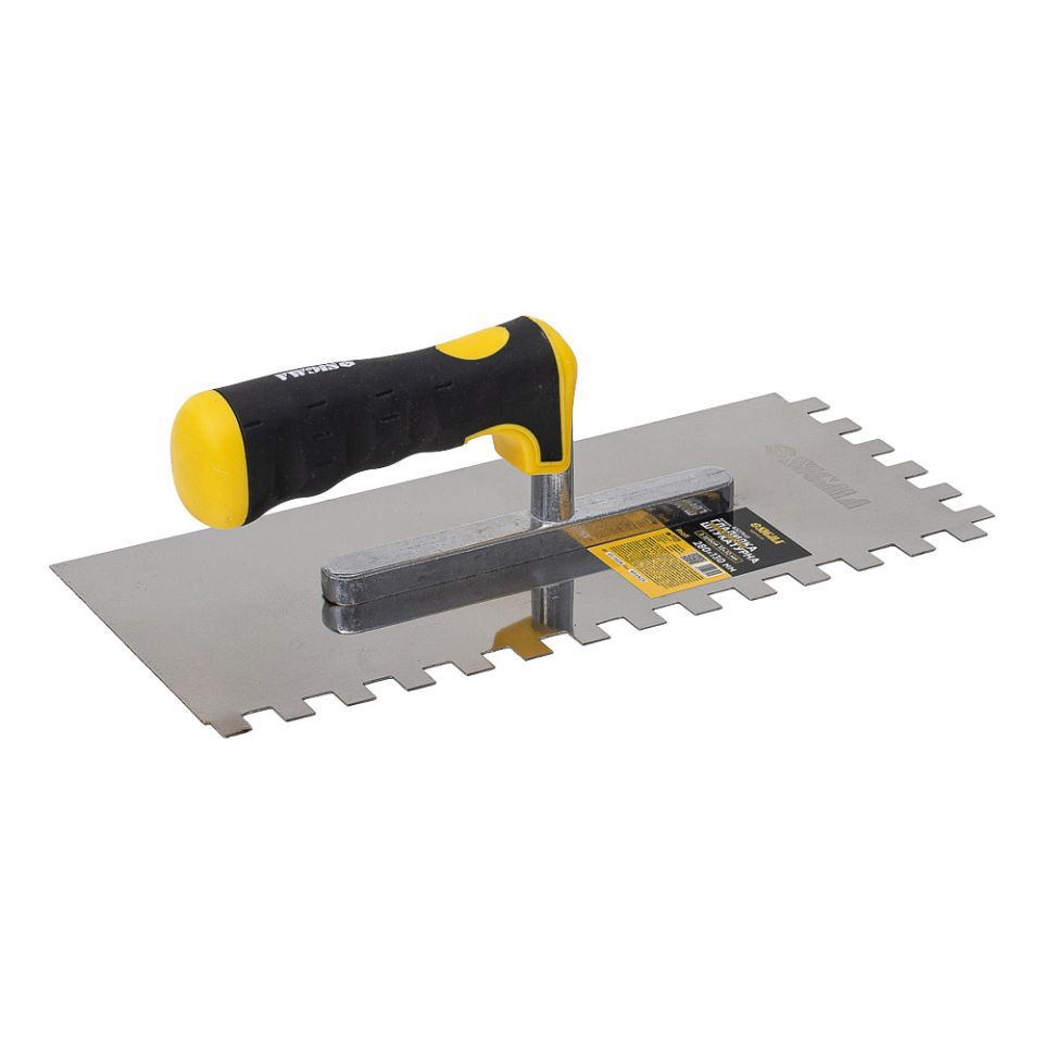 Гладилка нержавеющая штукатурная Profi 280×130мм c зубом 10×10мм SIGMA (8327541) предназначена для разглаживания отштукатуренной поверхности, а также для равномерного нанесения клеевого раствора при кладке плитки и выравнивания стен за счет использования различных размеров зубца.