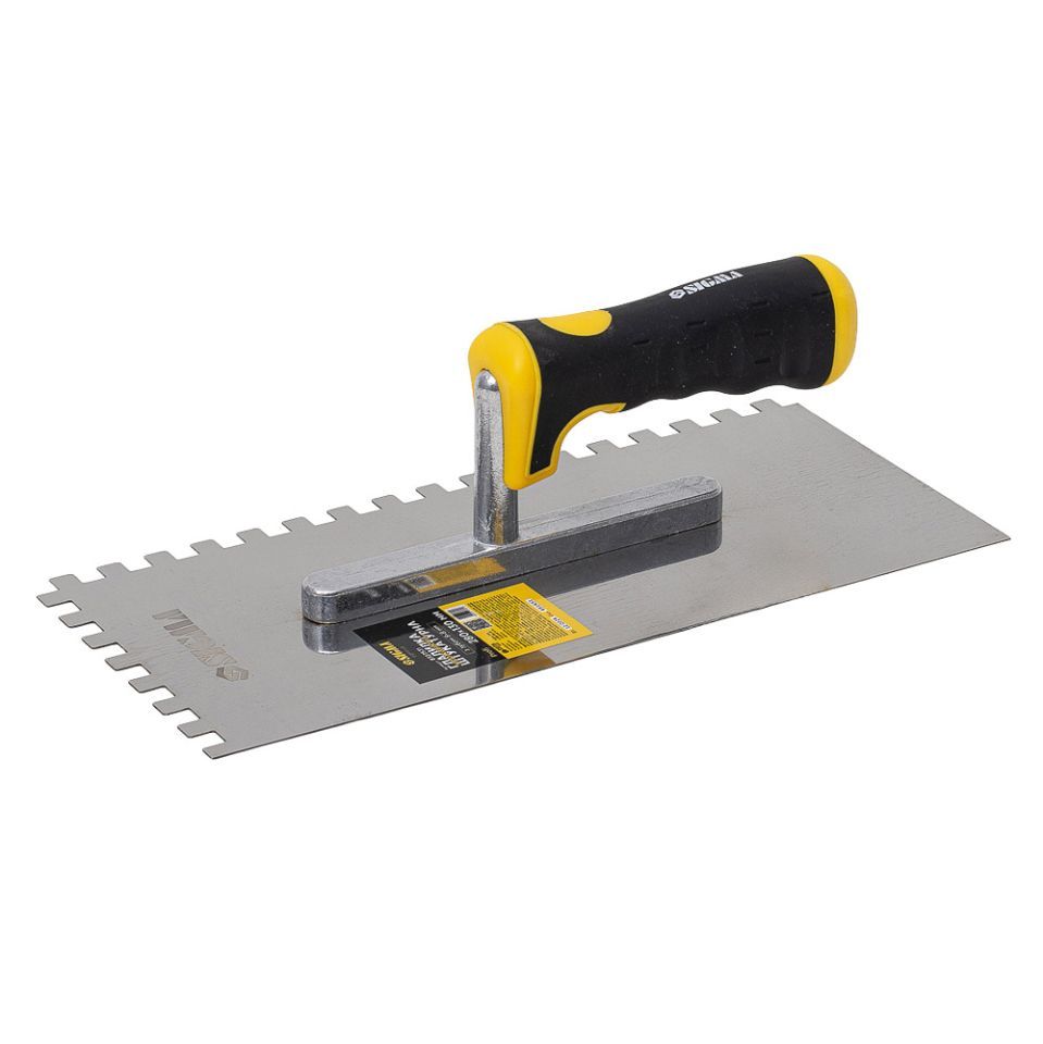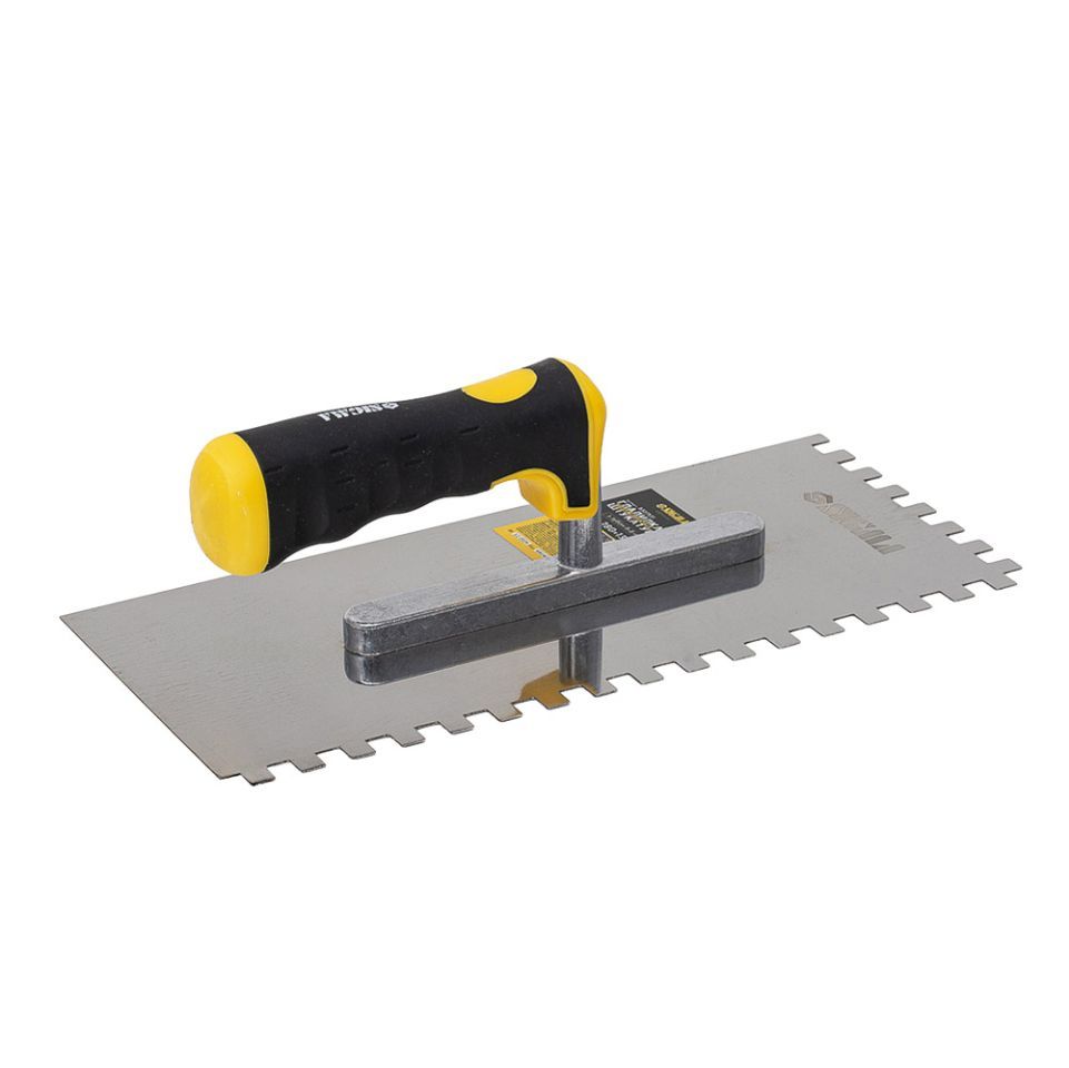 Гладилка нержавеющая штукатурная Profi 280×130мм c зубом 8×8мм SIGMA (8327531) предназначена для разглаживания отштукатуренной поверхности, а также для равномерного нанесения клеевого раствора при кладке плитки и выравнивания стен за счет использования различных размеров зубца.