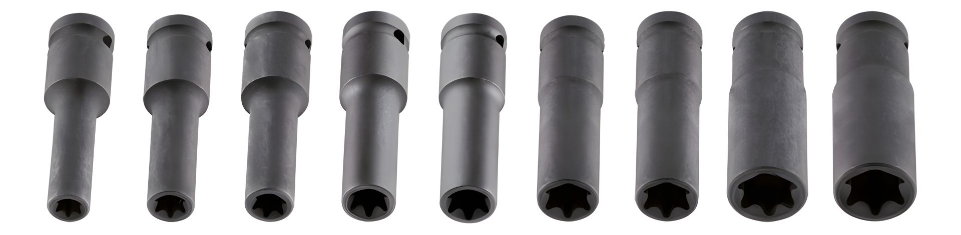 Головки сменные ударные Torx, длинные, 1/2, набор 9 шт., E10, E11, E12, E14, E16, E18, E20, E22, E24 мм, сталь CrMo, пластмассовая коробочка для хранения. NEO 12-110