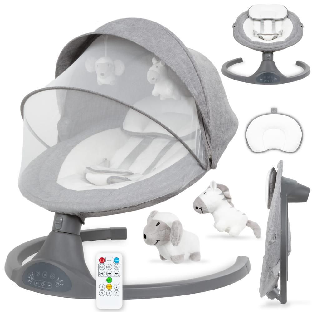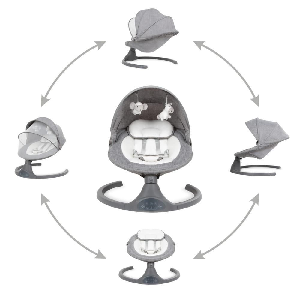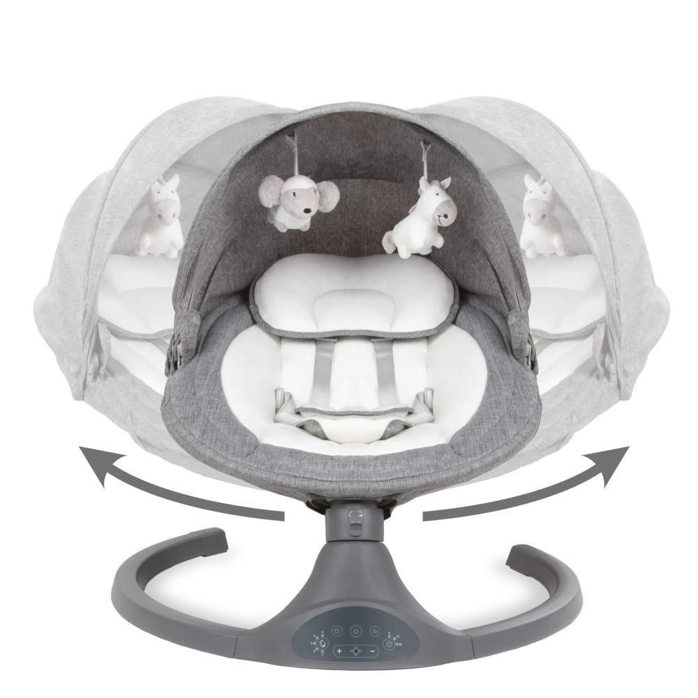 Электронный модуль Bloototh позволяет воспроизводить любимую музыку с телефона . Если вы предпочитаете выбрать что-то стандартное, в качалке есть 10 предустановленных мелодий и регулировка громкости. Для вашего удобства производитель предусмотрел два способа питания .электрическая качелька: на батарейках или адаптере переменного тока. Пятиступенчатая регулировка качания, в том числе соответствующая движениям малыша в животе мамы, понравится каждому малышу. Вы также можете настроить время качания от 8 до 30 минут. Безопасность ребенка обеспечат пятиточечные ремни безопасности и нескользящие накладки на стопу, а еще две съемные игрушки обеспечат развлечение, побуждая ребенка трогать и брать руками. Мотор устройства работает практически бесшумно , а для управления им можно использовать удобный пульт дистанционного управления. Качалку можно использовать на балконе и террасе благодаря съемной крыше и москитной сетке , защищающей от укусов насекомых.