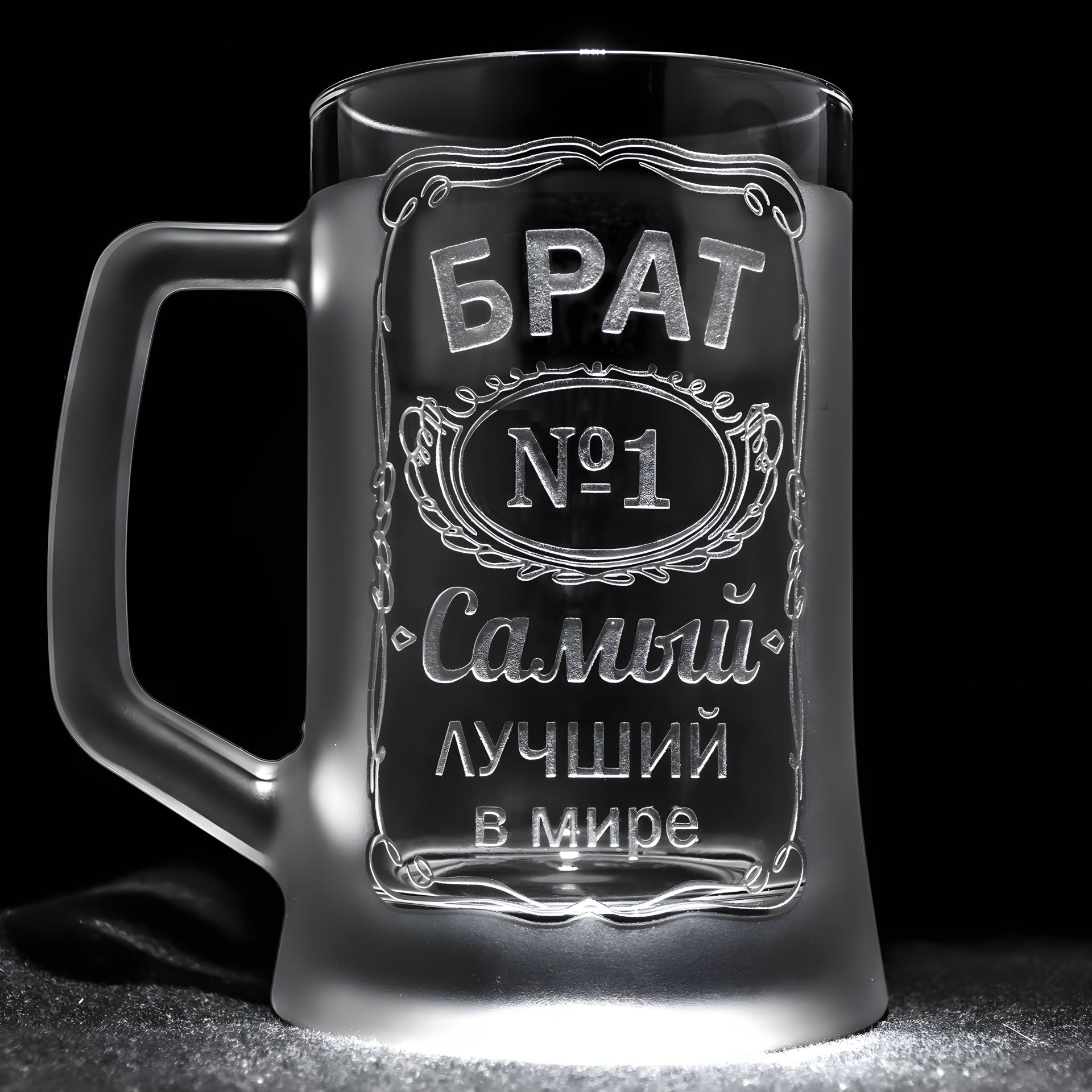 Стеклянная кружка для пива с ручной механической гравировкой надписи БРАТ №1 Самый лучший в мире, матовая в подарочной коробке
