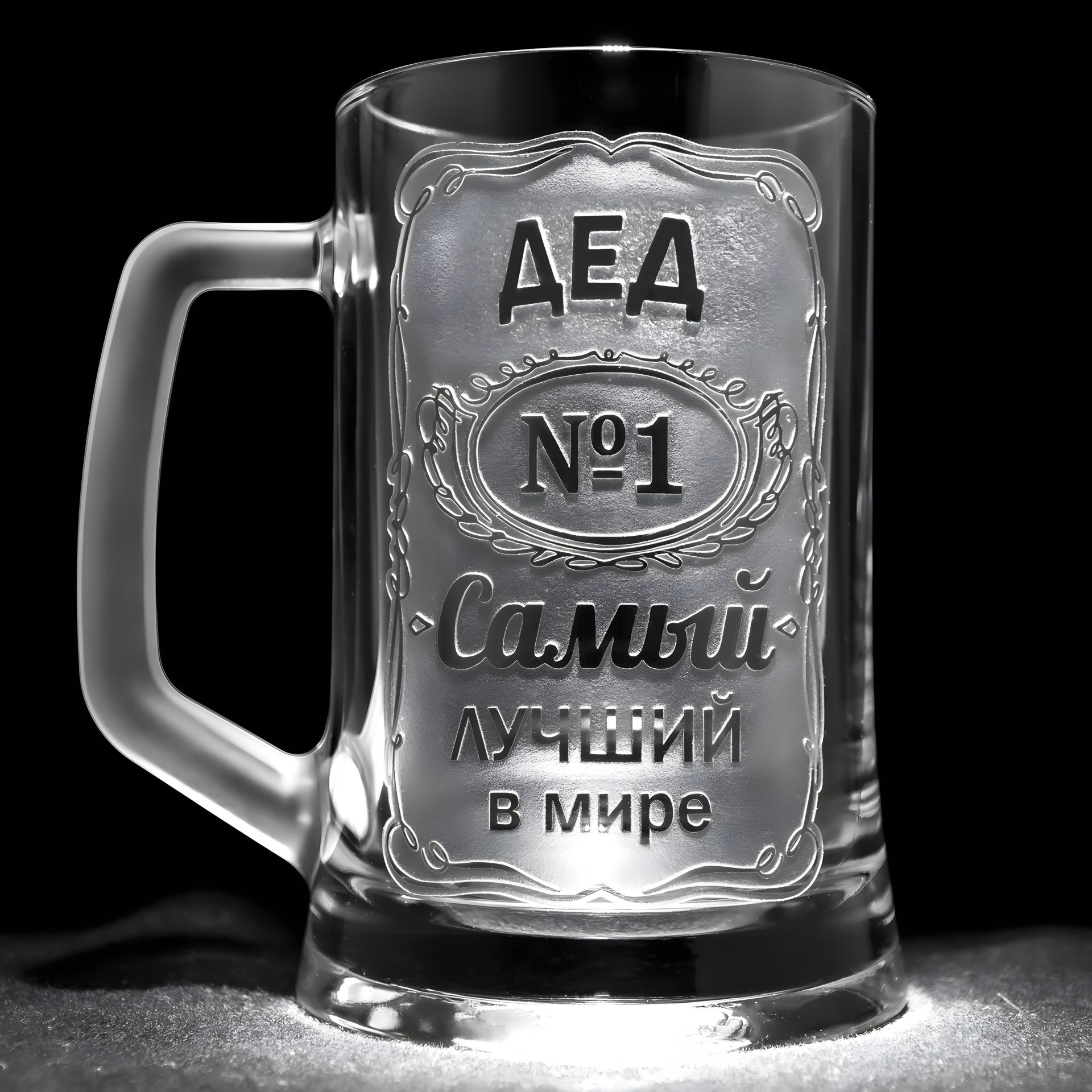 Стеклянная кружка для пива с ручной механической гравировкой надписи ДЕД №1 Самый лучший в мире, глянцевая с матовым окном в подарочной коробке
