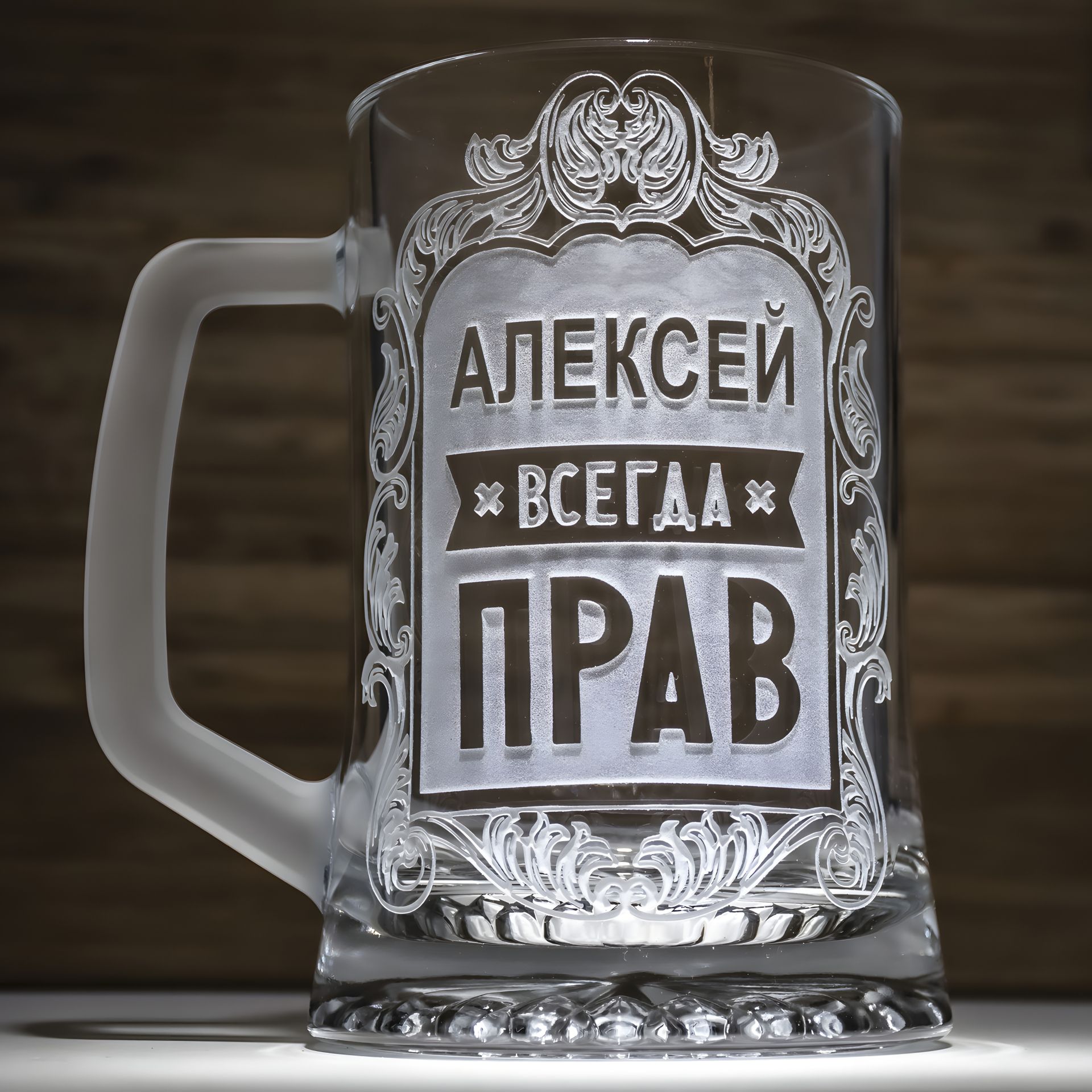 - Уникальность в деталях: Наш бокал для пива – это не просто стекло, это настоящее произведение искусства. Надпись "АЛЕКСЕЙ ВСЕГДА ПРАВ" выгравирована с любовью и вниманием к деталям в стильной матовой рамке, которая создает неповторимый вид изделия.