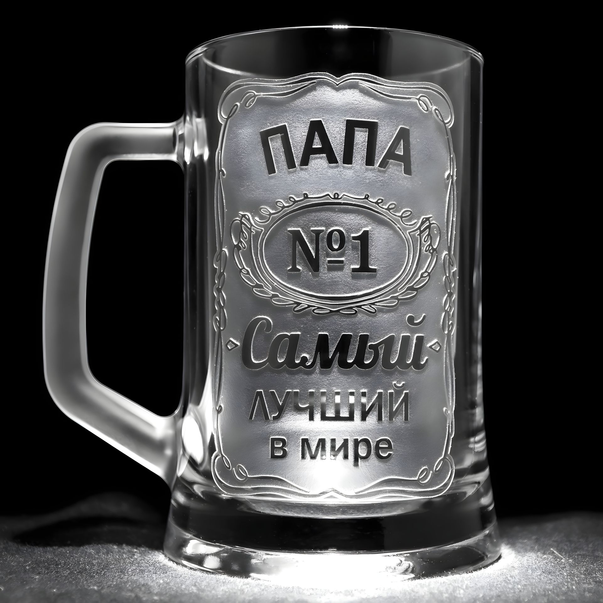 Стеклянная кружка для пива с ручной механической гравировкой надписи ПАПА №1 Самый лучший в мире, глянцевая с матовым окном в подарочной коробке