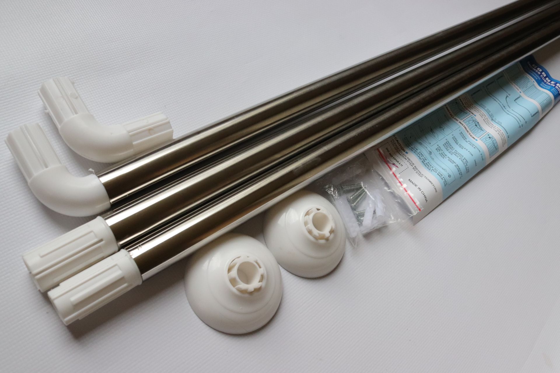 Карниз для ванної кутовий може збиратись у формі "Г" у розмірах 90*90 см та 180*90см, або у формі "П" у розмірі 90*90*90 см. Трубки металеві хромовані, кріплення пластикове. Для установки карниза потрібно свердління стін з двох боків, до стелі не кріпиться. Карниз має в комплекті 3 трубки по 90 см, 2 ковпачки на стіни, 2 кутових та 2 прямих з'єднувачі трубок, комплект болтів для кріплення у стіни.