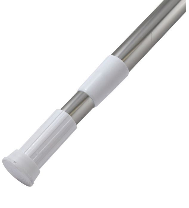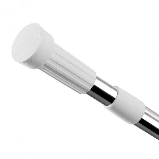 Карниз металевий на пружинній основі прямий, покритий хромом. Легко фіксується між стінами шляхом телескопа і пружини. Підходить для відстаней від 70 см до 120 см. Не вимагає свердління стін і будь-яких додаткових кріплень. Кілець в комплекті немає.