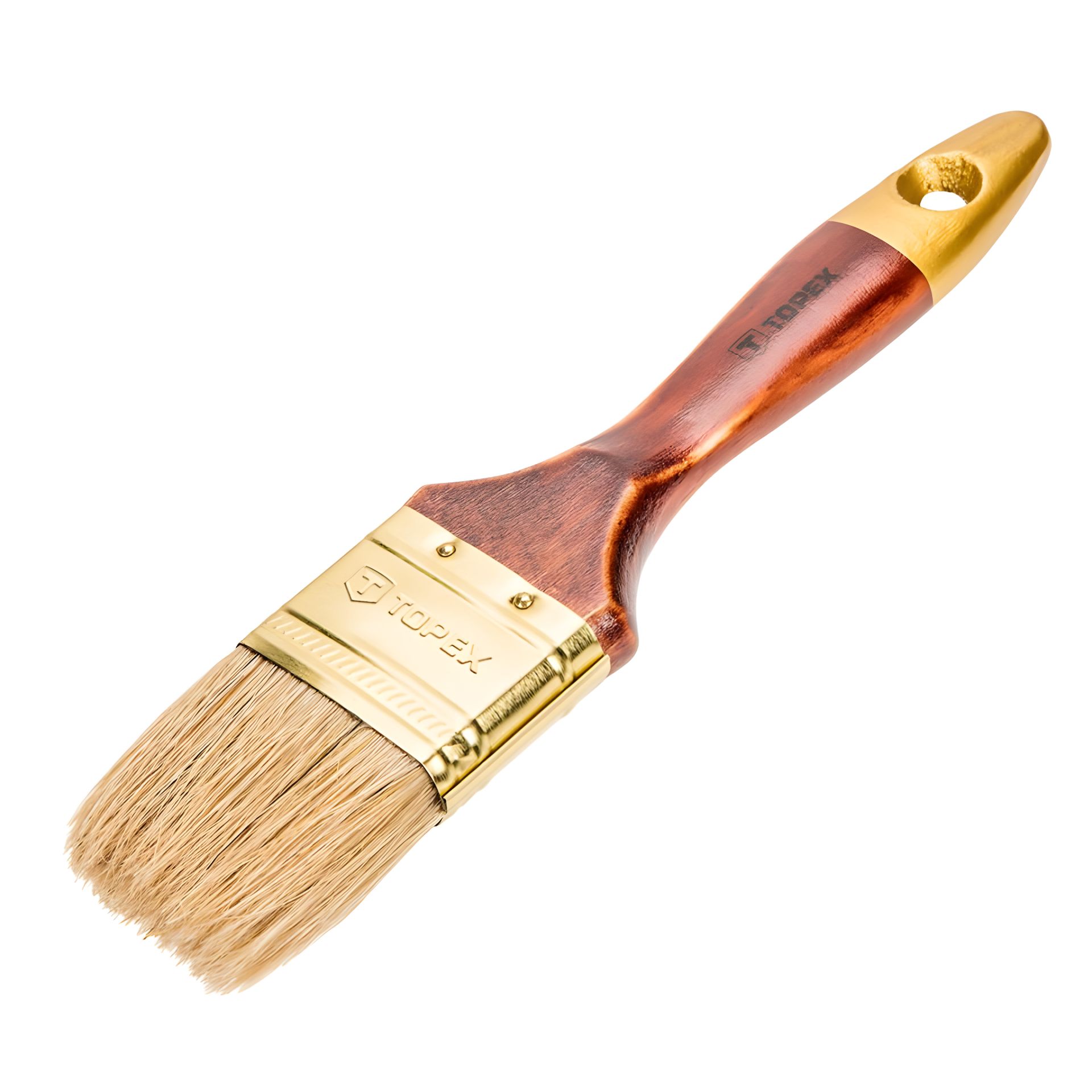 Кисть малярная TOPEX предназначена для работы с масляными красками. Натуральная щетина посажена на эпоксидный клей, что повышает качество кисти и предотвращает выпадение щетины. Деревянная рукоятка с защитным лаковым покрытием хорошо ложится в ладонь, что повышает комфорт работы. Бренд TOPEX предназначен для домашних мастеров.