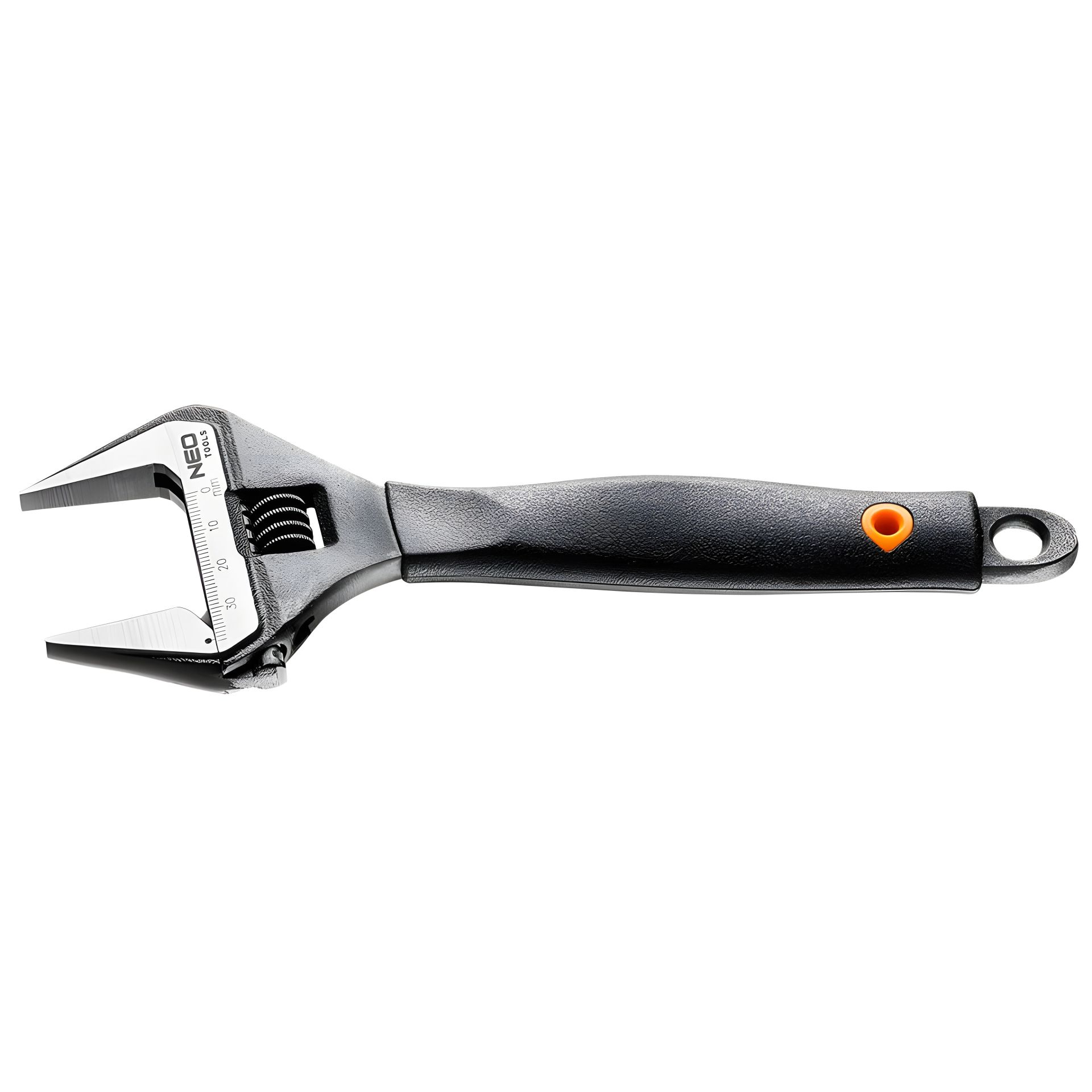 Ключ разводной NEO кованый из прочной хромованадиевой стали. Отличается очень широким рабочим диапазоном губок. Просвет губок на 40% больше, чем у стандартных ключей. Расширенная и утонченная головка позволяет работать в труднодоступных местах. Эргономичная рукоятка с TPR-покрытием, стойким к воздействию масел и смазок.