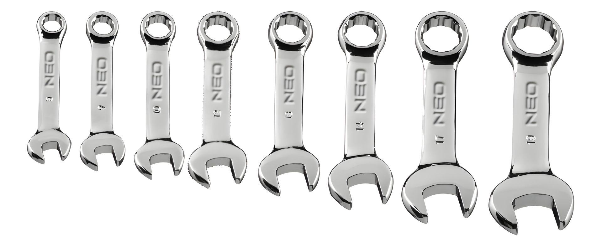 Набор коротких комбинированных ключей NEO. В наборе 8 ключей популярных размеров (от 8 до 19 мм), изготовленных в соответствии со стандартом DIN 3113. Высокосортная хромованадиевая сталь обеспечивает долгий срок службы. Короткое плечо ключа облегчает работу в труднодоступных местах. Инструмент упакован в удобный футляр с нанесенными номерами ключей, что способствует сохранению порядка. Качество инструмента подтверждено сертификатом TÜV и 25-летней гарантией производителя. Бренд NEO оправдывает ожидания профессионалов.