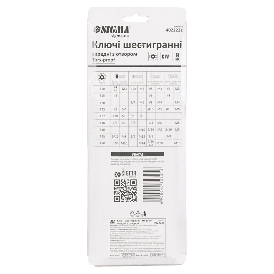 Ключи TORX 9шт T10-T50мм CrV (средние с отверстием) SIGMA 4022221