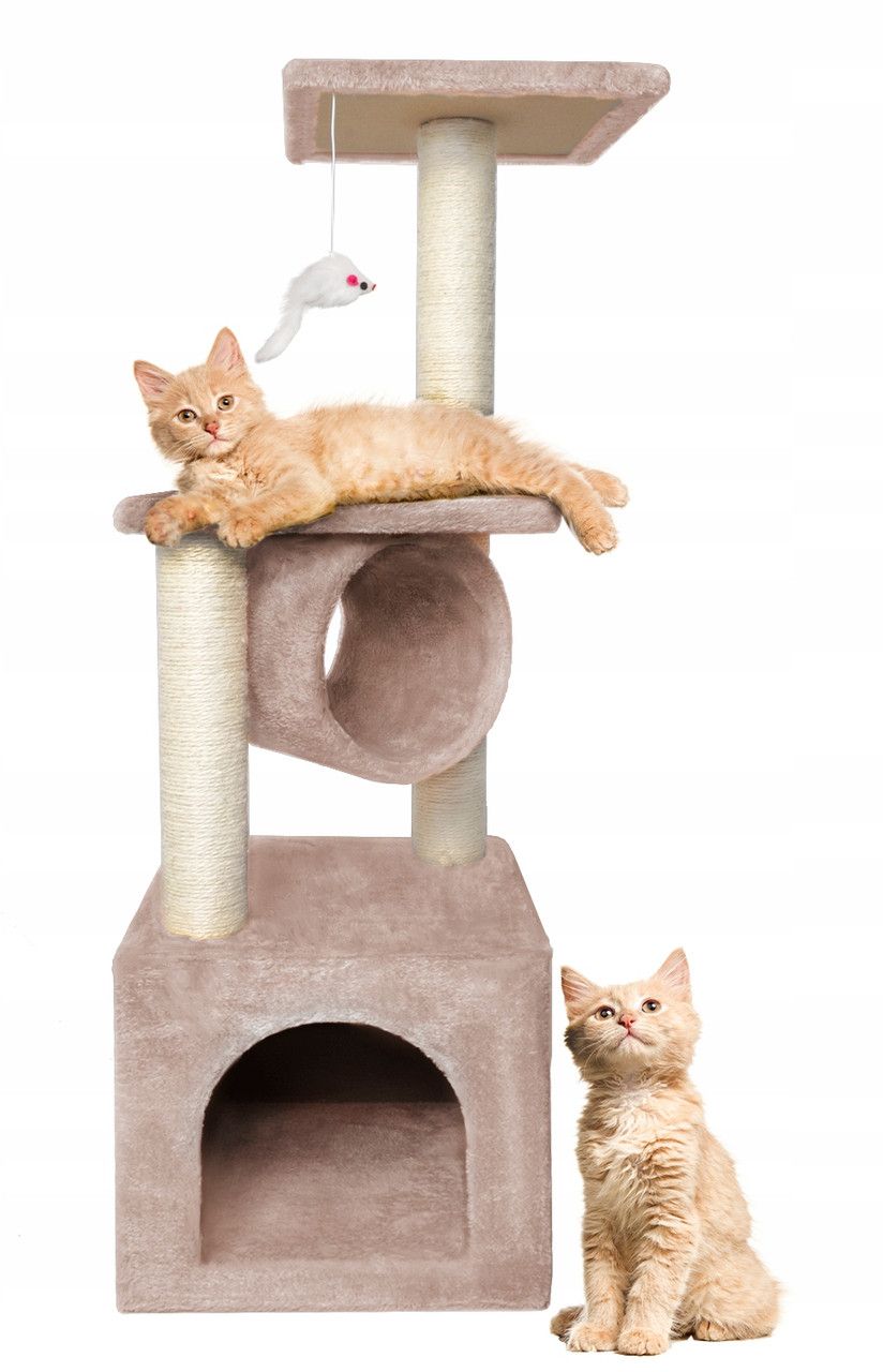 Полы кошачьей когтеточки покрыты очень мягким мехом, что гарантирует комфортный отдых с мурлыканьем на заднем плане. Главное достоинство дерева - уютный домик. Дополнительный вариант для релаксации - трубка, размещенная на 3-м уровне когтеточки. Котенок сможет свободно отдыхать. 5 уровней наблюдения удовлетворят кошачье любопытство. В случае скуки можно также поохотиться на мышку, закрепленную на резинке, которая находится на 4-м этаже когтеточки - ее можно поймать и атаковать.