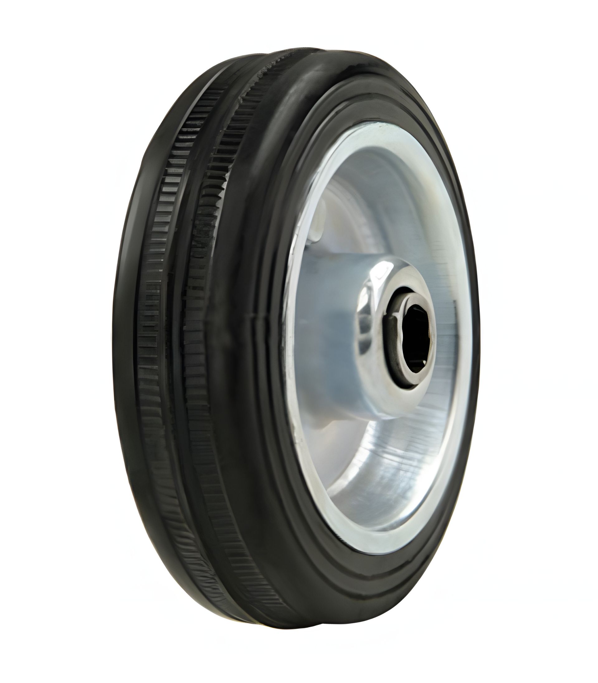 Колесо имеет диск из листового металла, изготовленный путем штамповки и внутри него роликовый подшипник. Главным отличием такого колеса это его износостойкость, ведь роликовый подшипник выдерживает гораздо большую нагрузку, чем обычный шариковый. Первая причина такой разницы в том, что он имеет большую рабочую длину, по этому менее подвержен таким явлениям как перекос колеса. Сам проректор изготовлен из литой резины. Такие колеса используют в основном на стеллажах и промышленных тележках, для езды в основном по разным поверхностям.