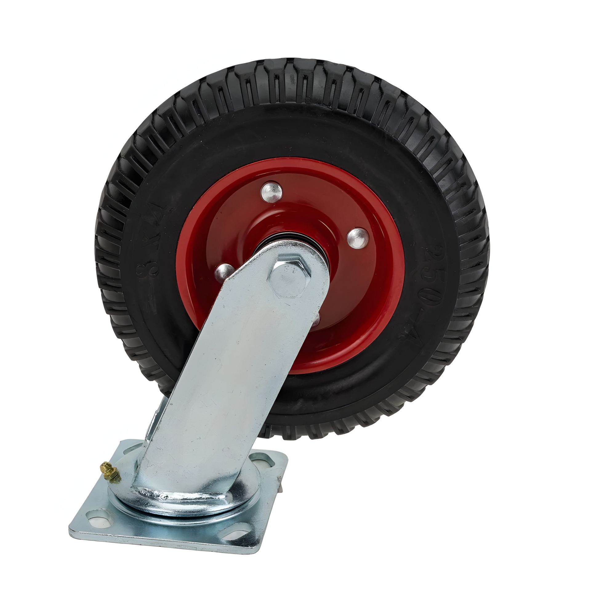 Поворотное колесо имеет специальный кронштейн с тормозом, состоящий из крепления колеса и платформы для крепления колеса к стеллажу или тележке, между ними установлен шариковый подшипник с прессмасой, они защищены пластиковым пыльником. Само колесо литое и шина полностью изготовлена из сплошной резины, а диск изготовлен из металла скрепленный между собой болтами, в ступице встроены два шариковых подшипника. Такое колесо не боится проколов и может работать на любой поверхности, их обычно устанавливают на грузовые тележки, стеллажи и баркасы.