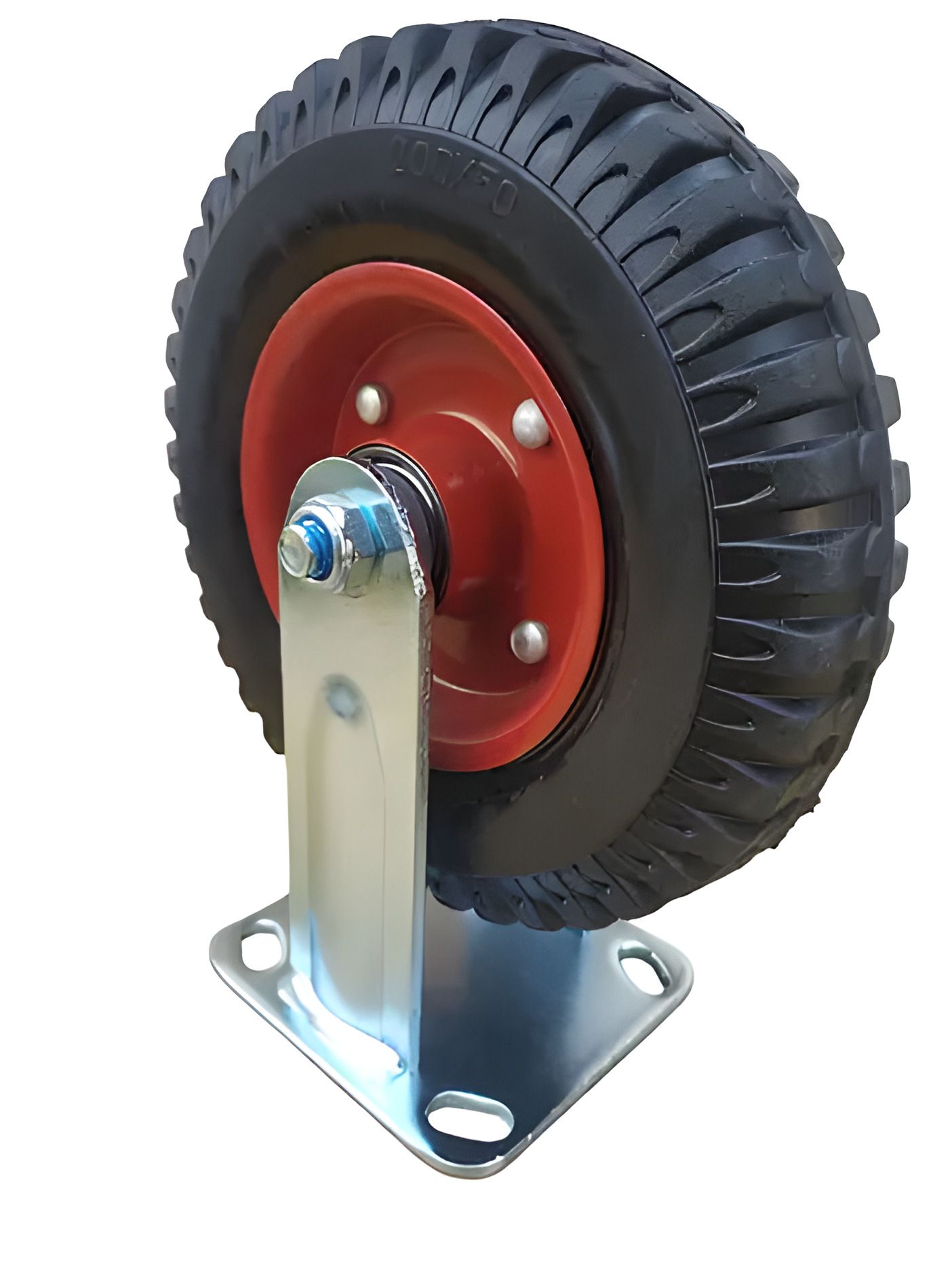 Благодаря цельнолитой покрышке – колесо поглощает удары, катится плавно и бесшумно. Такое промышленное колесо для тачки и тележки во время резких поворотов может оставлять следы на твердом покрытии. Эксплуатируется как на улице, так и в помещениях, при температуре окружающей среды от -20 до +60 °C. Может использоваться в торговых залах, СТО, фабриках и складах.