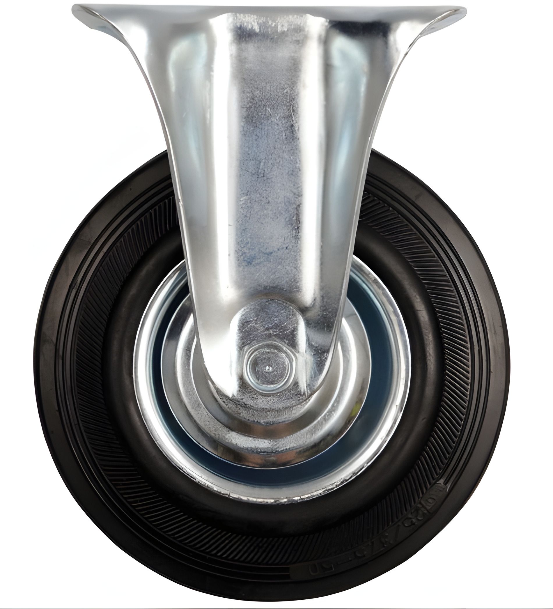 Колесо универсальное на стандартной черной резине с неповоротным кронштейном, созданное по всем требованиям и стандартам эксплуатации грузовых тачек и тележек, багажных контейнеров, передвижных стеллажей и другого торгового и ремонтно-строительного оборудования для перемещения грузов. Оцинкованный диск колеса (на заклепках, 2 колпака), изготовлен из качественной листовой стали методом штамповки. В оси колеса с симметричной ступицей установлен роликовый подшипник. Эластичная черная резина обладает ударопоглощающими и антивибрационными свойствами - катится без шума и вибраций, не повреждая поверхности, хорошо сцепляя с любым типом покрытия - асфальт, бетон, кафель, паркет, линолеум и т.д. Такое промышленное колесо для тачки и тележки во время резких поворотов, может оставлять следы на твердом покрытии, но легко выдерживает разные препятствия и неровности (пороги дверей, разные канавки, рельсы и т.п.), как на улице так в помещениях при температуре окружающей среды от -20 до +55 градусов.