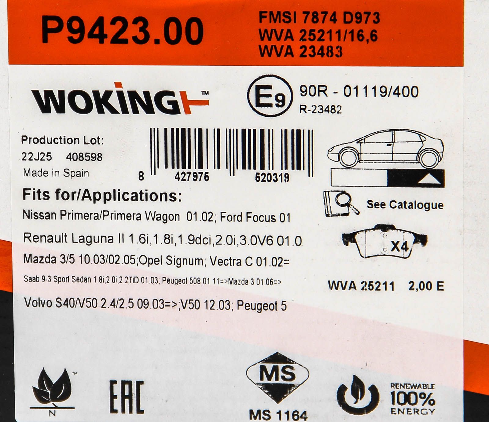 Тормозные колодки c-max/vectra/laguna/leon /ibiza/c30/c70/v40/primera 1.6-2.8 04-, WOKING (P942300)