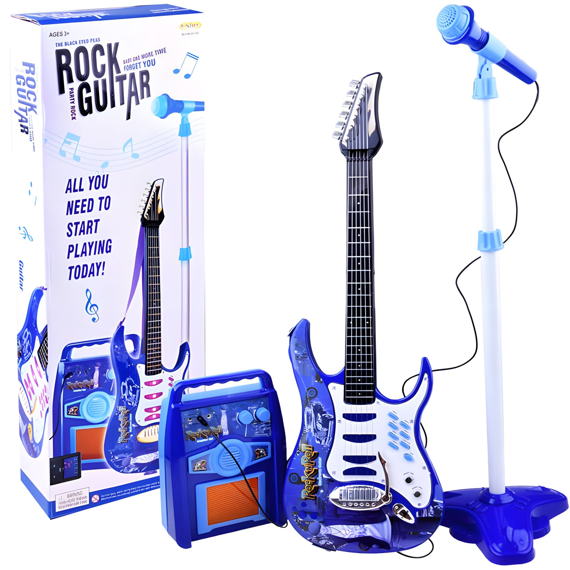 Нашумевшая детская электрогитара в комплекте с усилителем и стойкой с микрофоном обязательно понравится каждому маленькому любителю музыки и выступлений перед публикой. Весь набор синий, поэтому, если ваш ребенок тоже любит этот цвет - вы попали в нужное место. Гитара с усилителем позволит вашему ребенку почувствовать себя на сцене настоящим артистом. Как музыкальная звезда на концерте, ваш ребенок с гитарой и микрофоном будет сочинять прекрасные мелодии и петь им песни. Безумный концерт сопровождается мигалками в гитаре и усилителе.