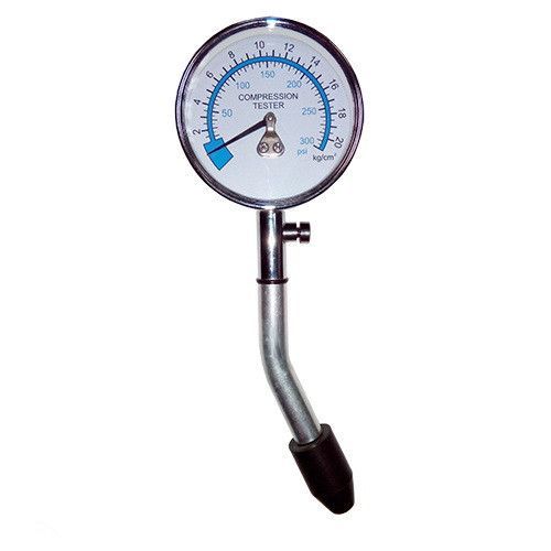 Полная шкала диаметром 2,5". Две шкалы различного цвета: 0-300 psi, 21 кг/см2. Универсальный конический резиновый наконечник подходит ко всем отверстиям для свеч зажигания.